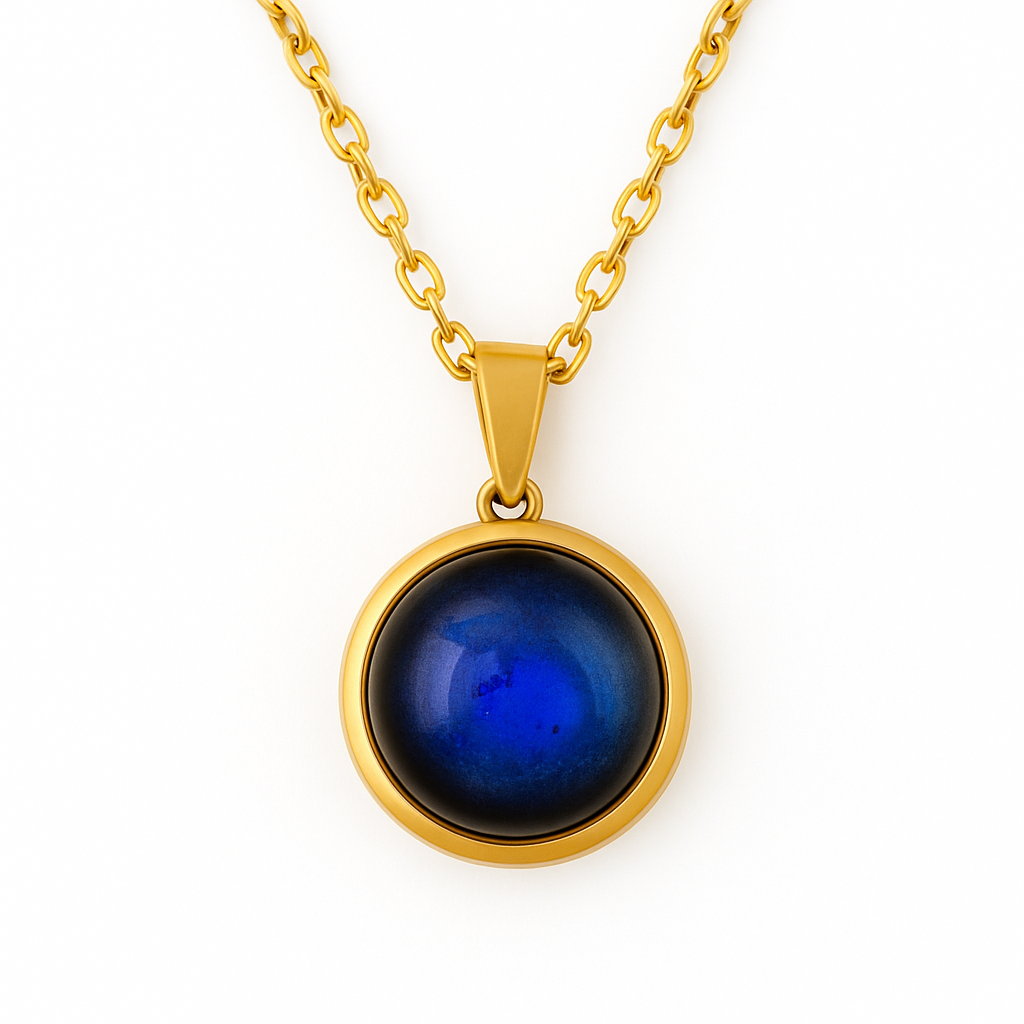 Der Stein ist in einen eleganten Anhänger aus Edelstahl mit 18 Karat PVD-Beschichtung eingefasst und hängt an einer 2 mm starken Ankerkette mit verstellbarer Länge, die so konzipiert ist, dass sie perfekt sitzt, egal ob sie allein oder in mehreren Schichten getragen wird.