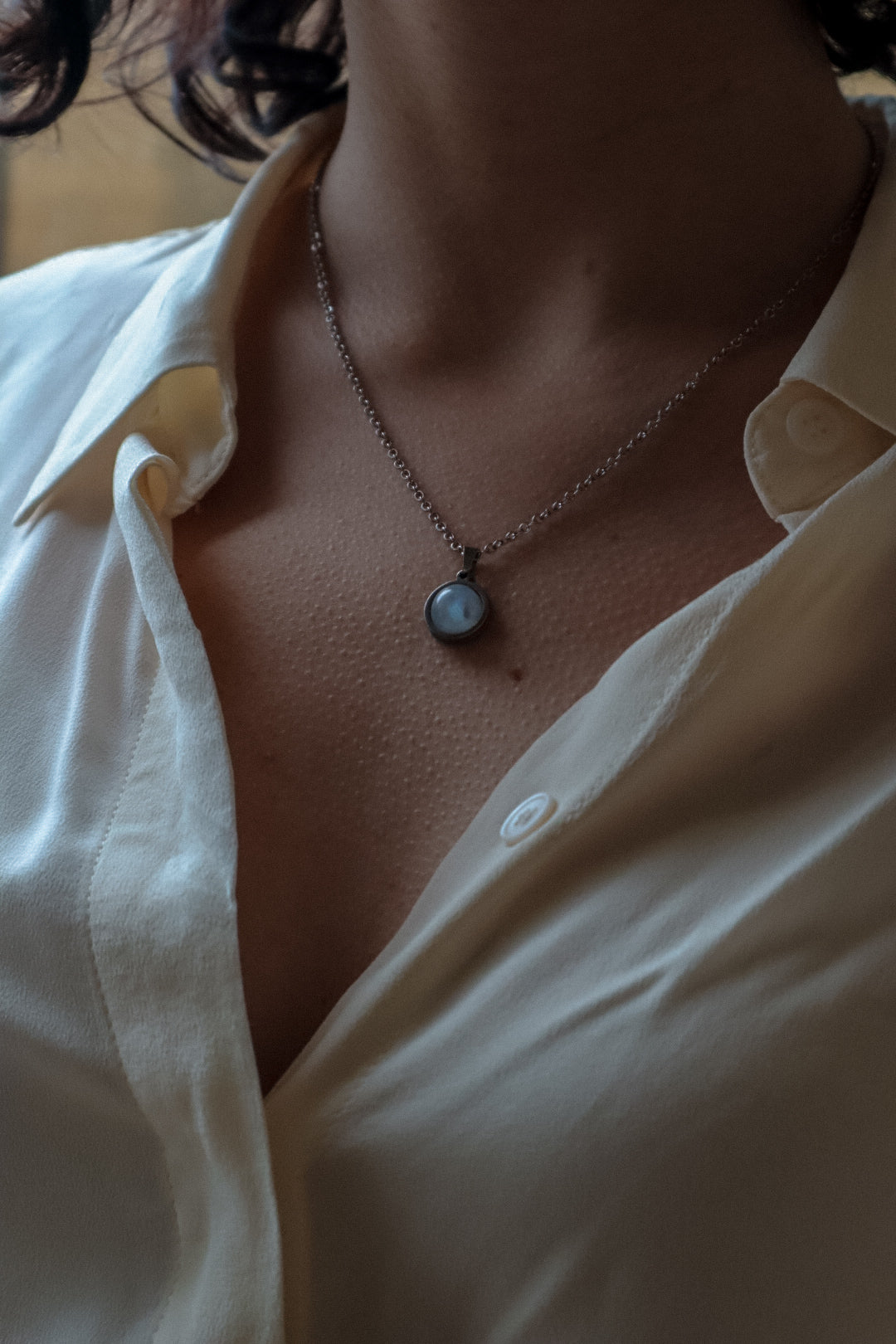 Dieser Anhänger verfügt über einen polierten Regenbogenmondstein-Edelstein mit einem Durchmesser von 10 mm, der ein wunderschönes Farb- und Blitzspiel zeigt, das an eine geheimnisvolle Mondnacht erinnert.