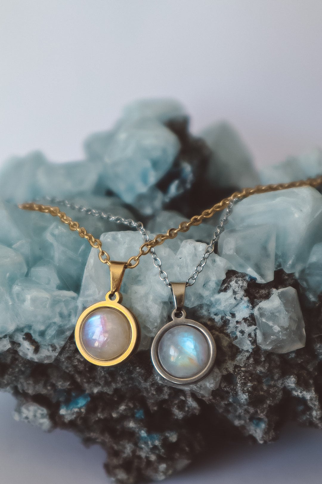 Wir stellen Ihnen unsere Regenbogen-Mondstein-Halskette vor, ein wirklich faszinierendes Stück, das den natürlichen Reiz von Mondstein mit der zeitlosen Eleganz von Edelstahl verbindet.