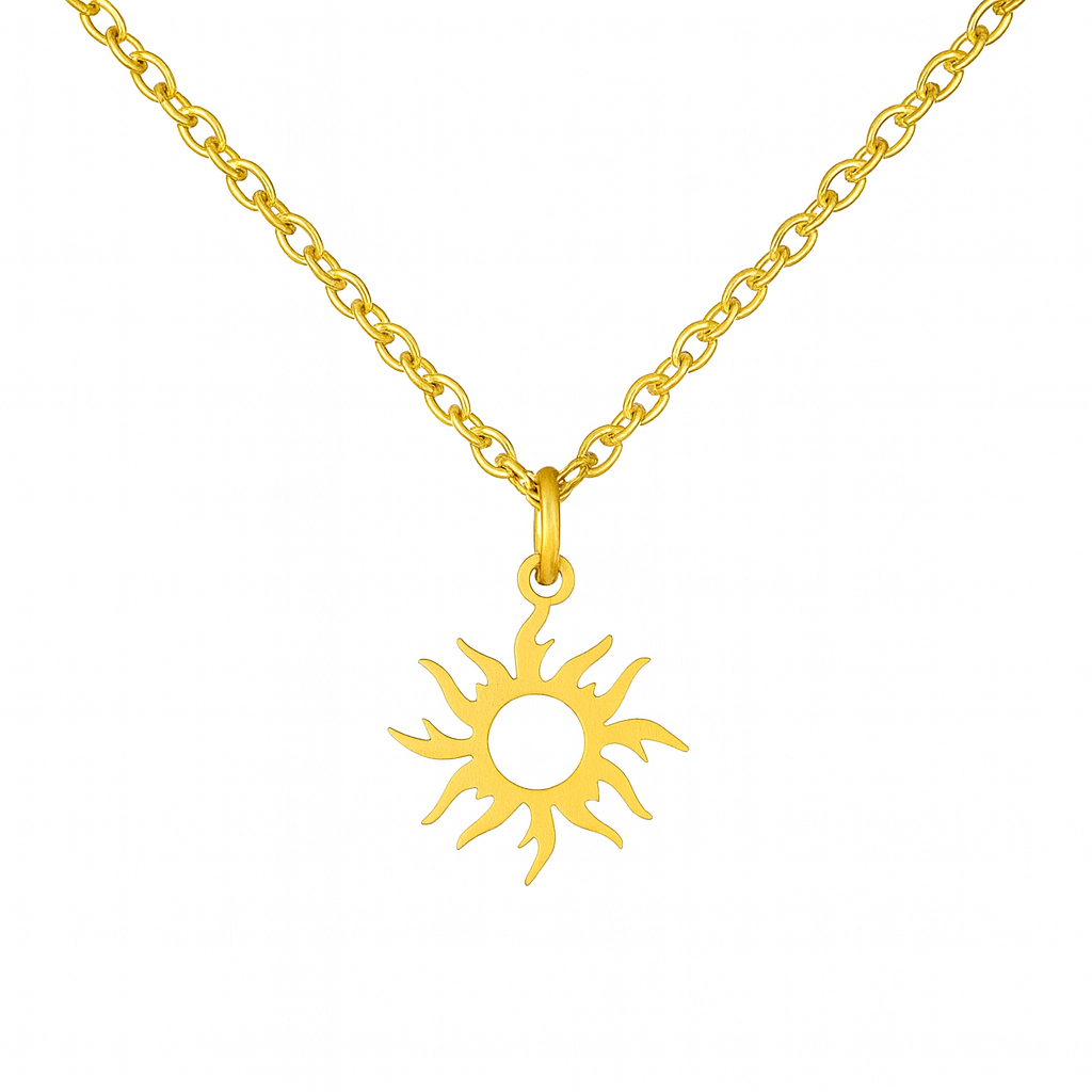 Die aus robustem, goldfarbenem Edelstahl handgefertigte Sonnenkette ist ein Talisman der Stärke und Erneuerung, der Sie daran erinnert, aufzustehen, zu strahlen und Licht zu tragen, wohin Sie auch gehen.