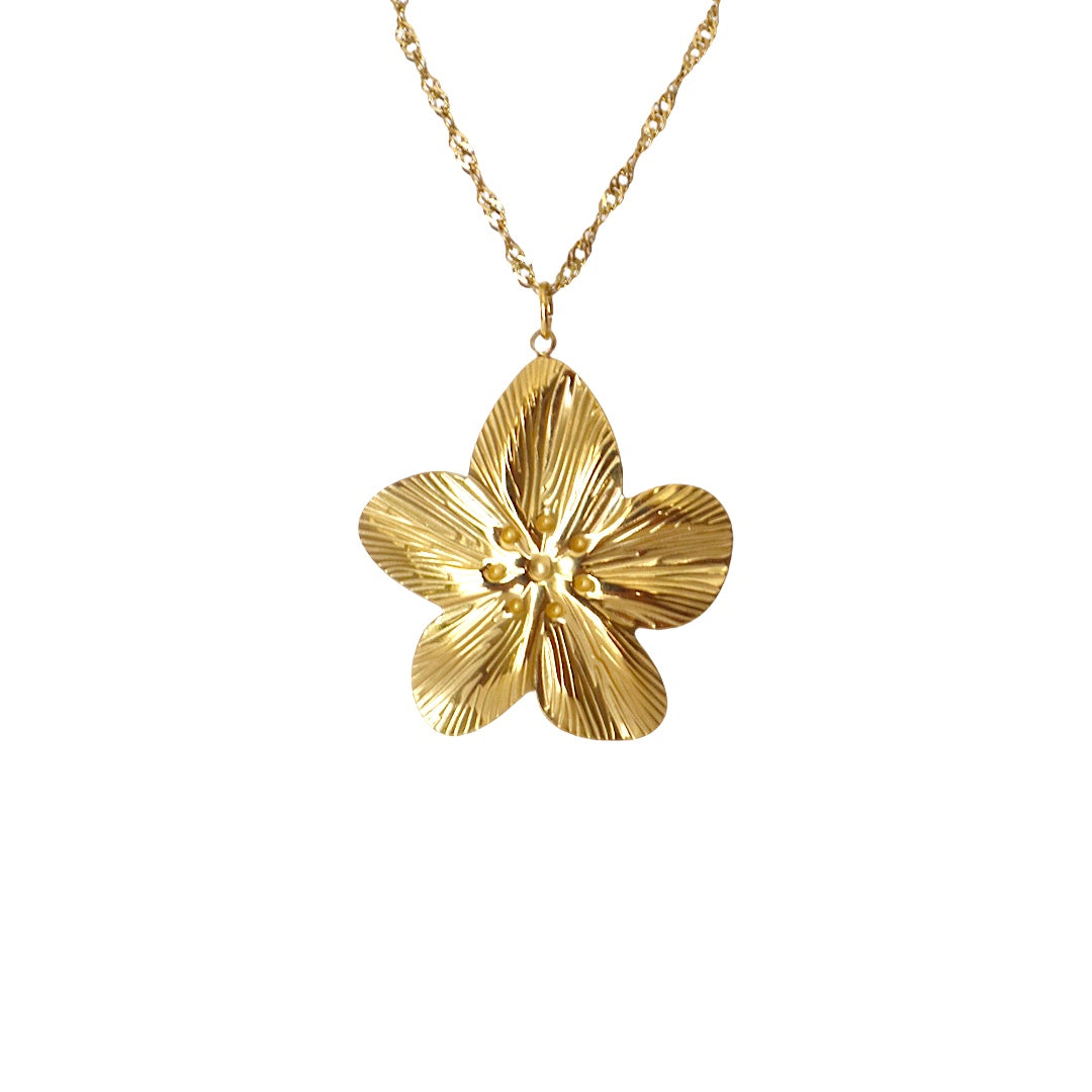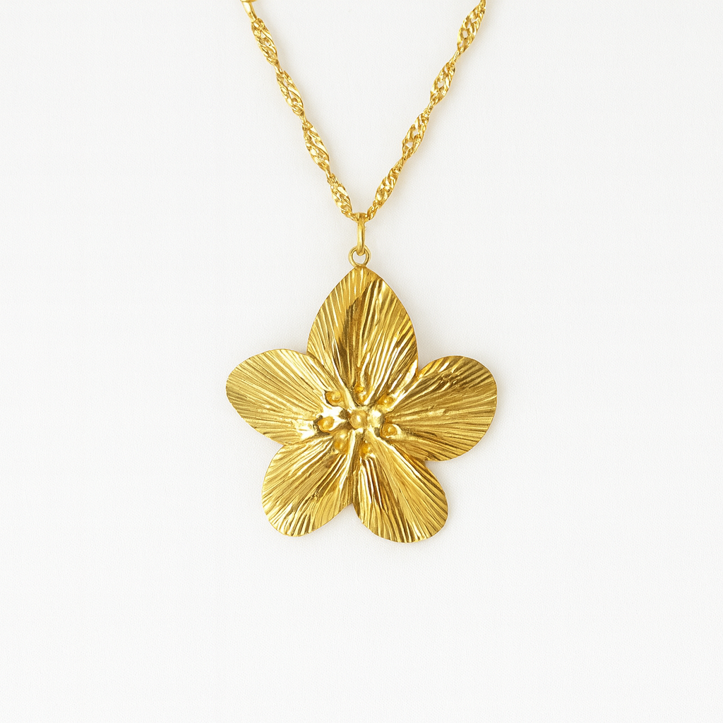 Der florale Anhänger hängt an einer eleganten, gedrehten Kette und strahlt goldene Wärme aus. Er fesselt mühelos Licht und Aufmerksamkeit. Ein Schmuckstück, das Ihrem Alltagsritual Ruhe und Kraft verleiht – perfekt für mehrere Lagen oder als Solo-Accessoire.