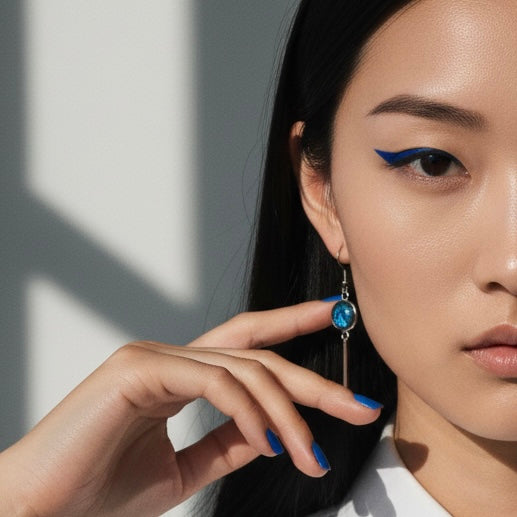 Mondschein trifft auf Meeresfeuer in den KALA -Ohrringen – ein Design, das die stille Alchemie von Licht und Stein einfängt. In der Mitte ruht ein polierter blauer Labradorit-Edelstein, der in Blau-, Grau- und Silbertönen schimmert, die sich wie Wasser im Sternenlicht bewegen. Darunter schwebt ein schlanker silberner Stabanhänger, der für anmutige Bewegung sorgt und klaren Minimalismus mit einem Hauch von Dramatik verbindet.