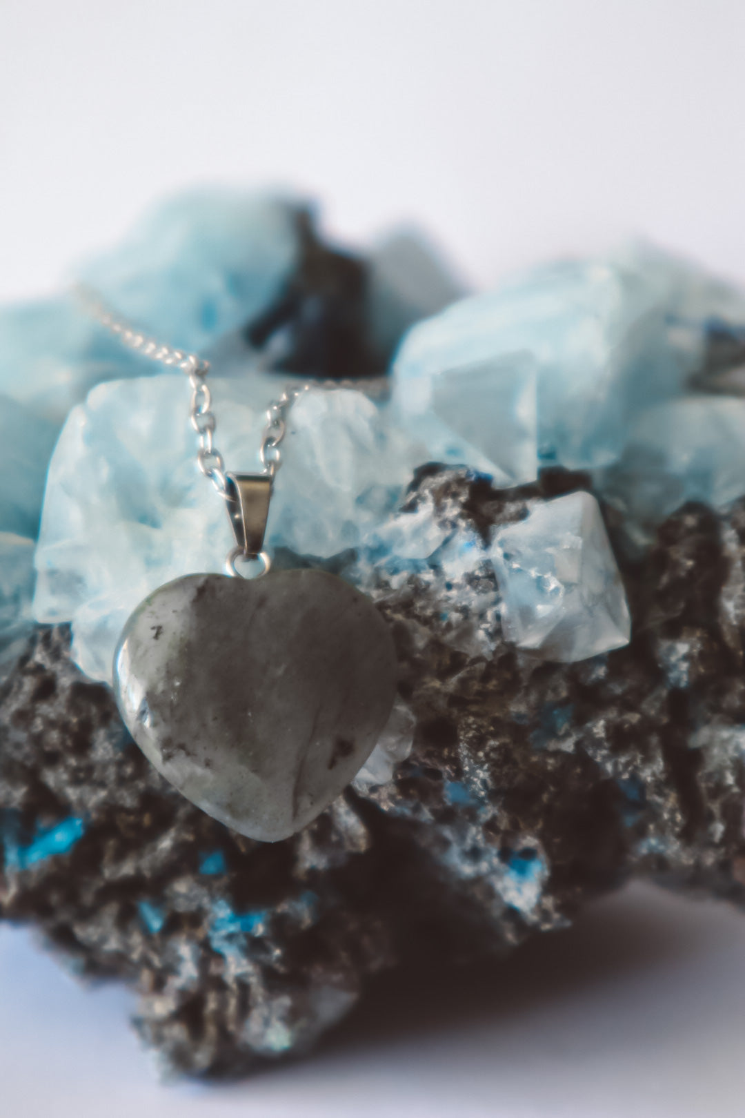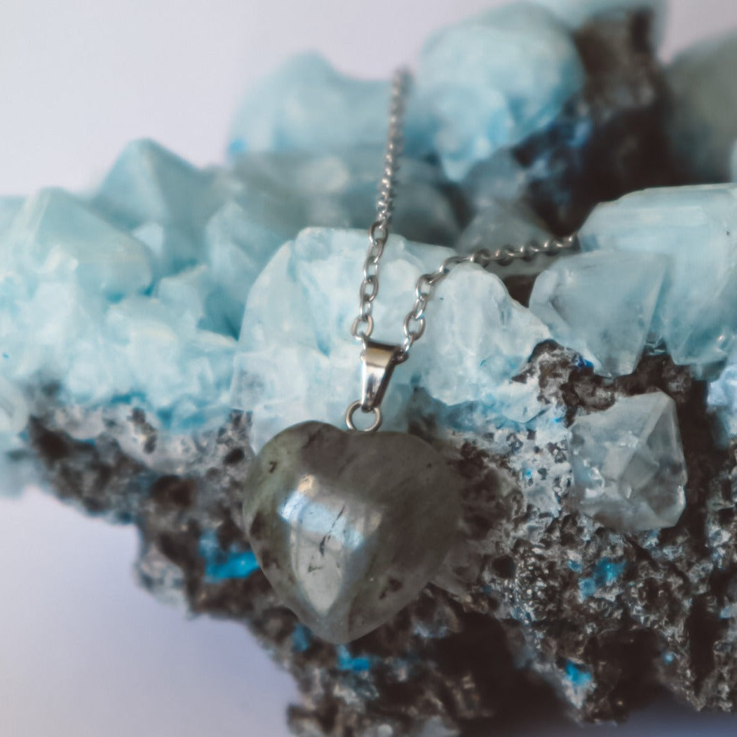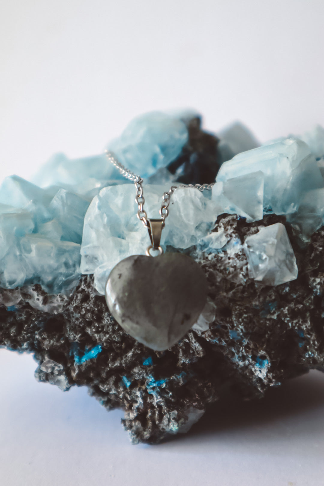 Kristallanhänger in Herzform aus Labradorit-Edelstein.