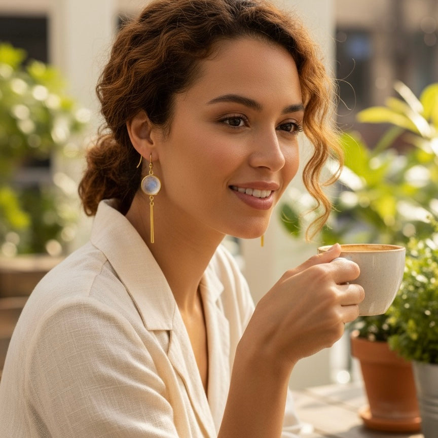 Wir stellen Ihnen unsere exquisiten baumelnden Ohrringe mit weißem Regenbogenmondstein vor, die perfekte Mischung aus Eleganz und Zauber. Diese mit Präzision und Sorgfalt gefertigten Ohrringe unterstreichen Ihren Stil und verleihen jedem Outfit einen Hauch ätherischer Schönheit.