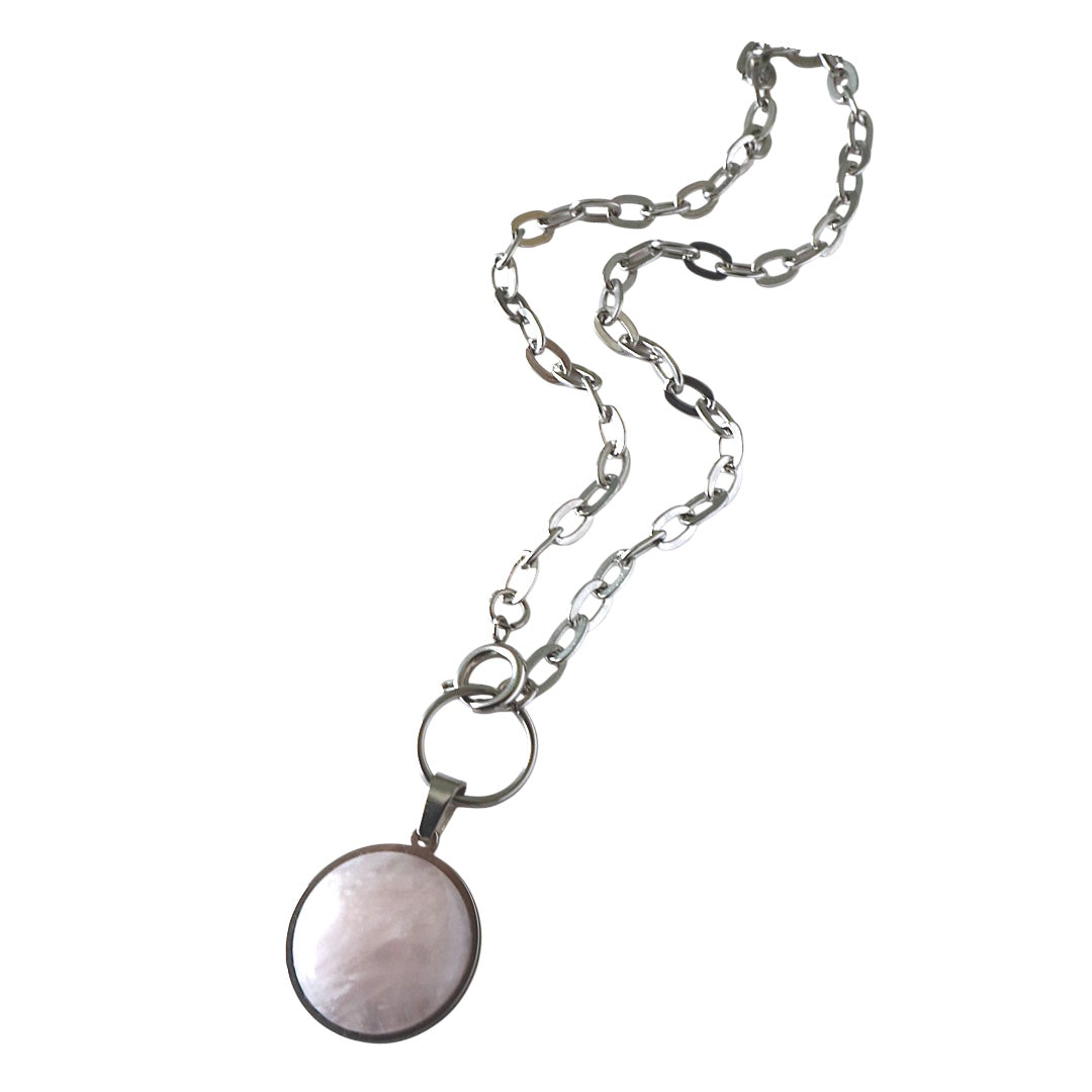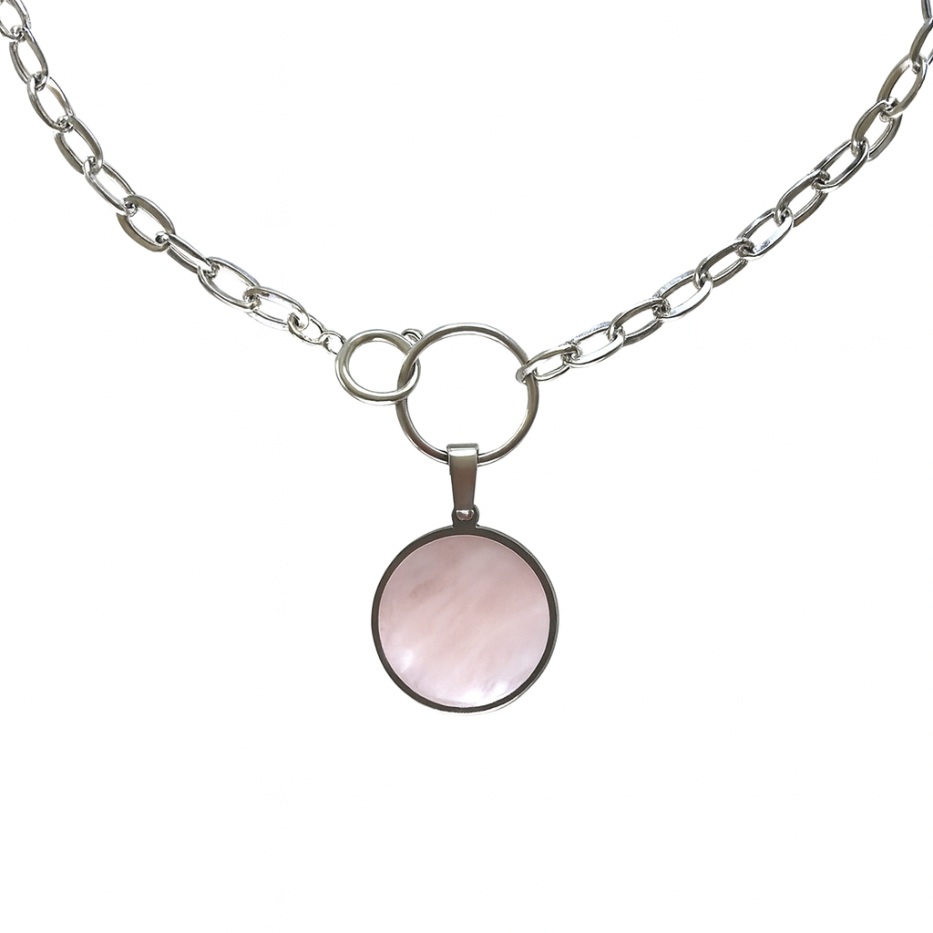 In der Mitte befindet sich ein polierter 20 mm großer Rosenquarzanhänger in einer glatten Zargenfassung, der an einem silbernen O-Ring hängt, der gleichzeitig als Verschluss dient. Der Anhänger hängt wie ein Lichttropfen am Hals und erinnert an die stille Kraft des Herzchakras und die magnetische Anziehungskraft der Selbstliebe.