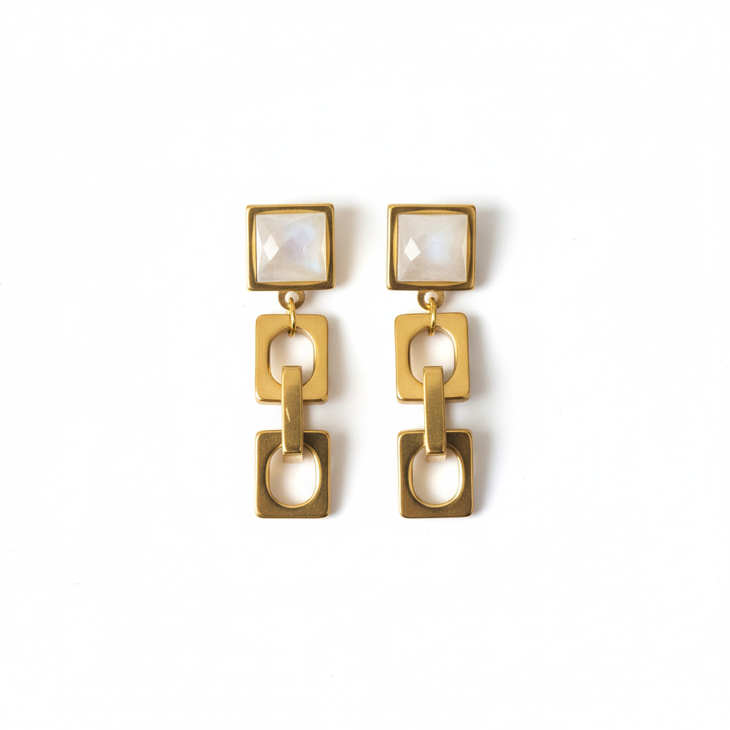 Wo Mystik auf moderne Eleganz trifft. Diese handgefertigten quadratischen Ohrhänger bestehen aus echtem facettiertem Regenbogenmondstein, der mit Lichtblitzen tanzt und Klarheit, Ausgeglichenheit und göttliche weibliche Energie symbolisiert. Das Design, das an einem schlanken Ohrstecker aus goldfarbenem Edelstahl hängt, verbindet kühne Geometrie mit ätherischem Charme. Geschaffen für alle, die sich von Intuition und der Magie des inneren Wachstums angezogen fühlen. Handgefertigt in unserem Heimstudio, sind sie leicht, strahlend und bereit für Ihren Alltag oder Ihre zauberhafte Nacht.