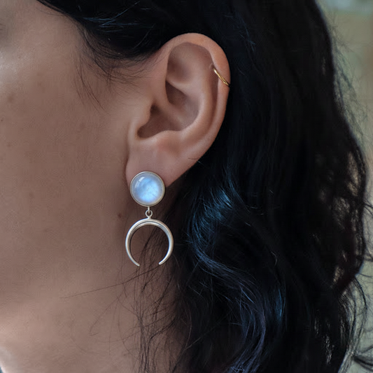 ANUK Rainbow Moonstone Crescent Moon Charm Earrings Silver
