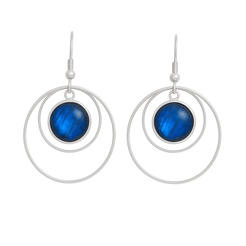Mystical and refined, the ANETHA earrings embody the quiet power of transformation. At their heart rests a polished 12mm blue labradorite gemstone, alive with shifting flashes of oceanic blue and silvery grey. Set within sleek double hoops of silver stainless steel, each earring measures approximately 4cm across, creating a balanced design that is bold yet endlessly wearable.