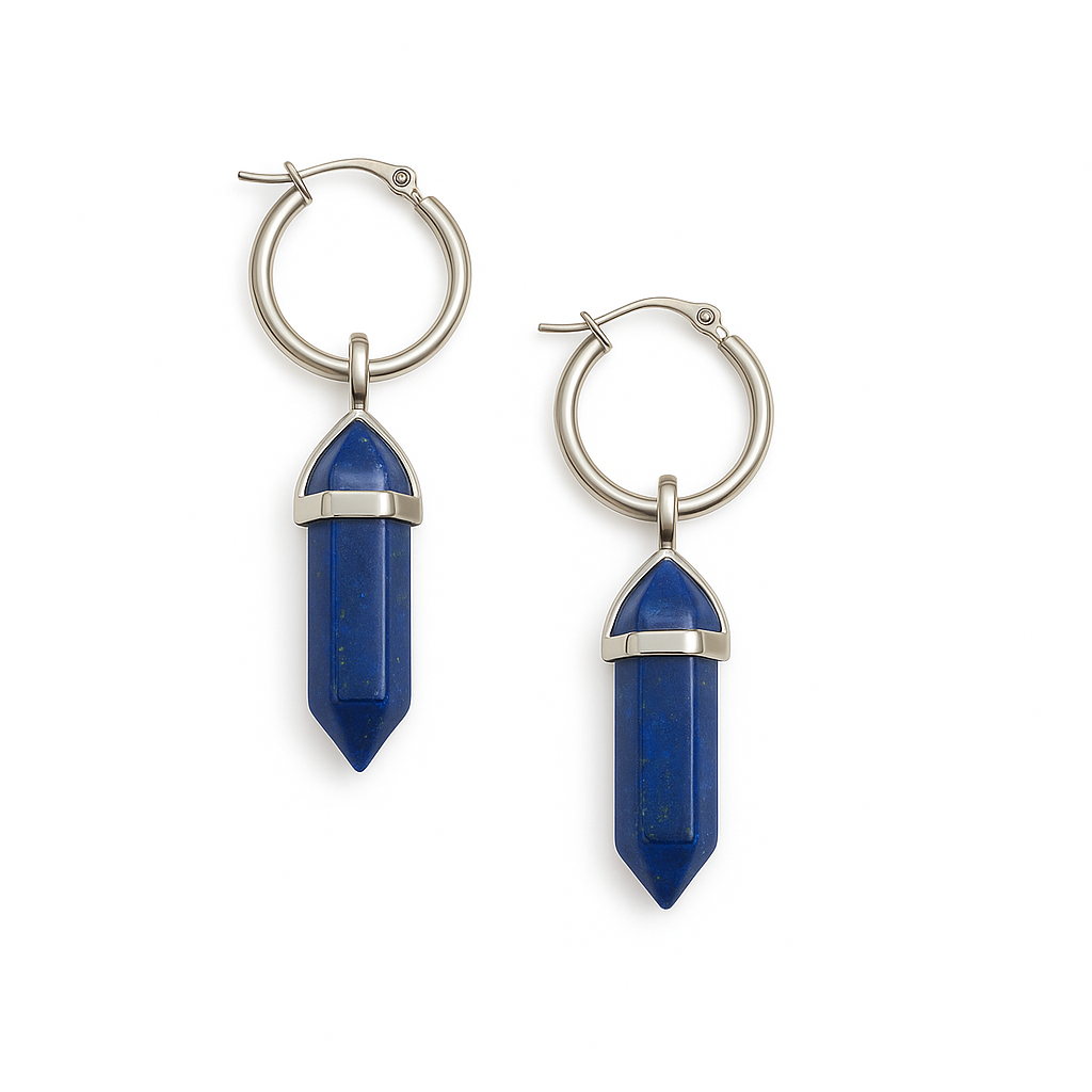 A fragment of night sky framed in silver, the Cercle Earrings in Lapis Lazuli embody wisdom, truth, and timeless elegance. Handcrafted from polished silver stainless steel, each hoop holds a 12mm lapis lazuli gemstone—its deep blue surface flecked with golden pyrite, like stars scattered across midnight skies. With a 20mm diameter, these hoops strike the perfect balance between everyday refinement and statement presence.