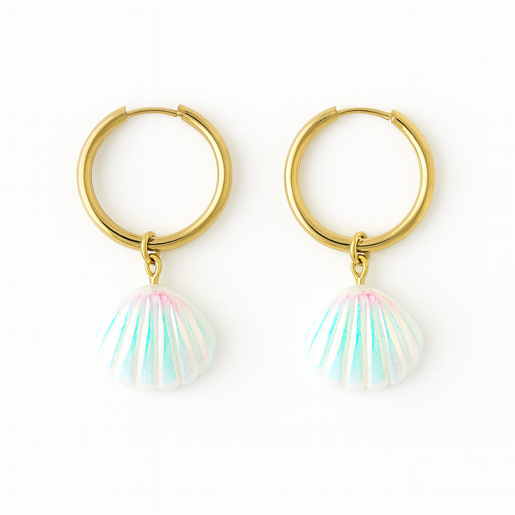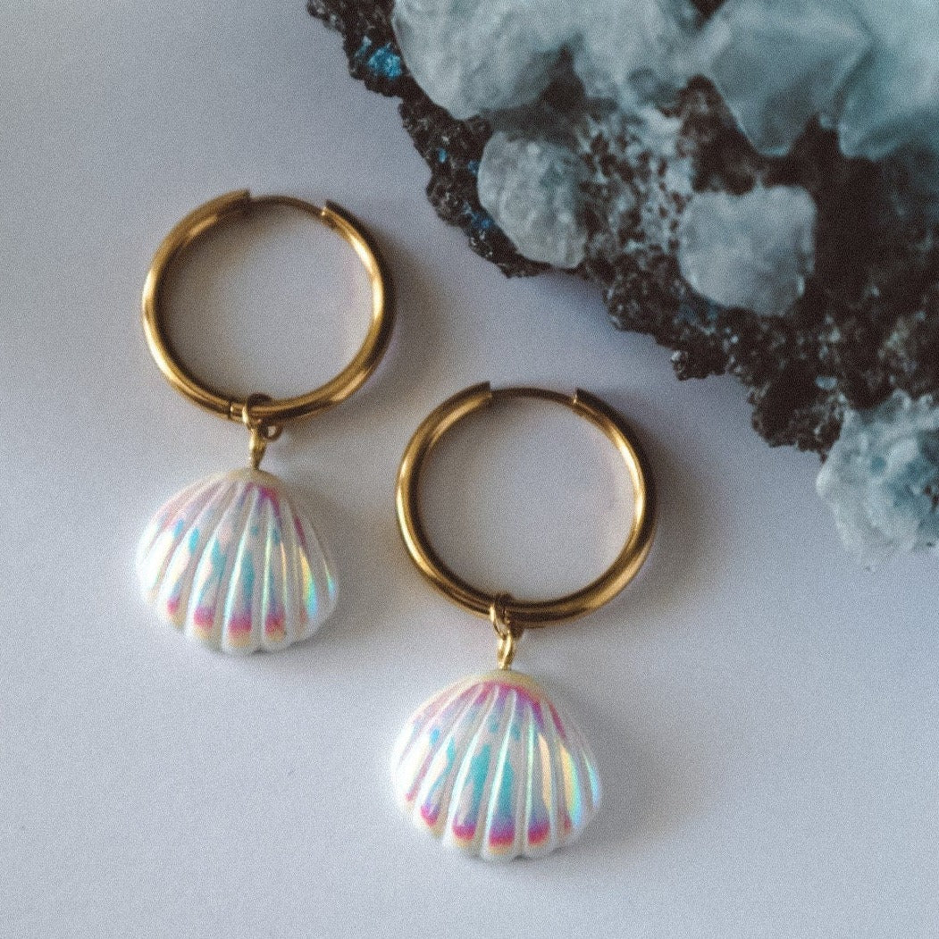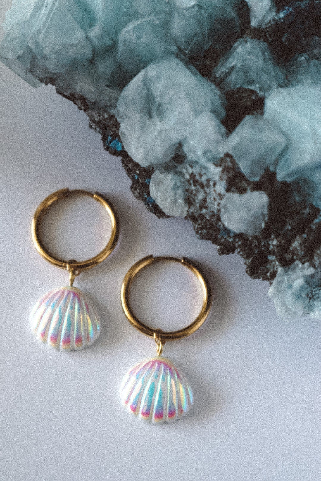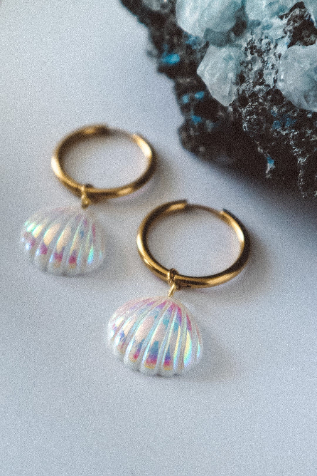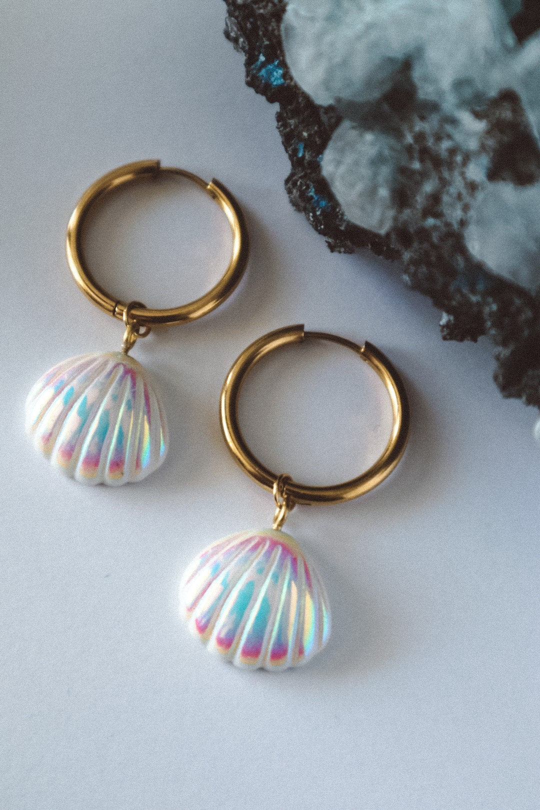 At the center of each hoop, you'll discover a captivating resin charm. This 3D seashell charm is carefully crafted with meticulous attention to detail, showcasing the natural beauty of the ocean. The seashell charm features a white hue that represents purity and tranquility, enhanced by a holographic rainbow aura coating. This coating adds a touch of magic, reflecting an array of colors that shimmer and dance as light interacts with the earrings.