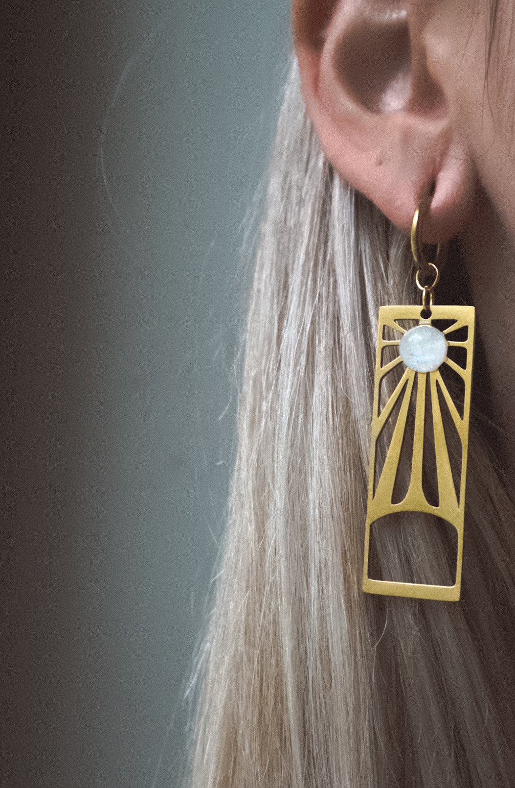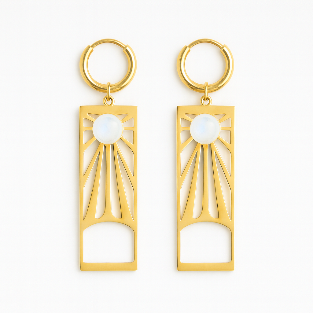 Sunrise captures the quiet magic of light emerging from shadow, with a glowing rainbow moonstone set as the heart of the rising sun. Its 8mm surface shimmers with ethereal hues of blue and white, radiating serenity and luminous energy. Dangling from sleek hoops, the design balances elegance with symbolic strength.