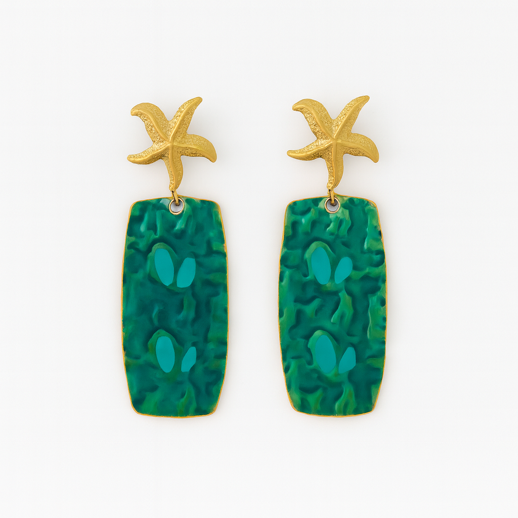 A tribute to the sea’s rhythm, the Thalassa Earrings capture the play between stillness and motion. At the top, delicate starfish studs glimmer with golden detail, anchoring the design in quiet simplicity. From each starfish, a bold rectangular charm cascades downward, adorned with deep blue enamel and swirling sea-wave patterns that shimmer with fluid movement. Together they create a striking silhouette—small details meeting statement scale.