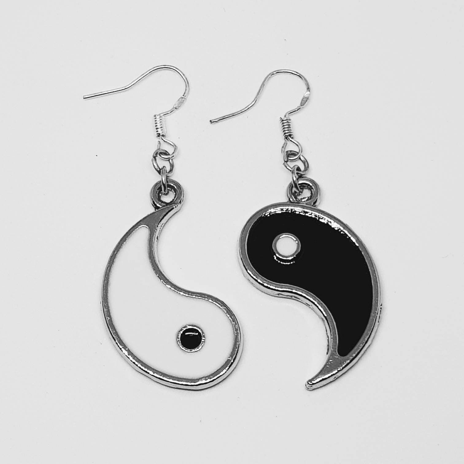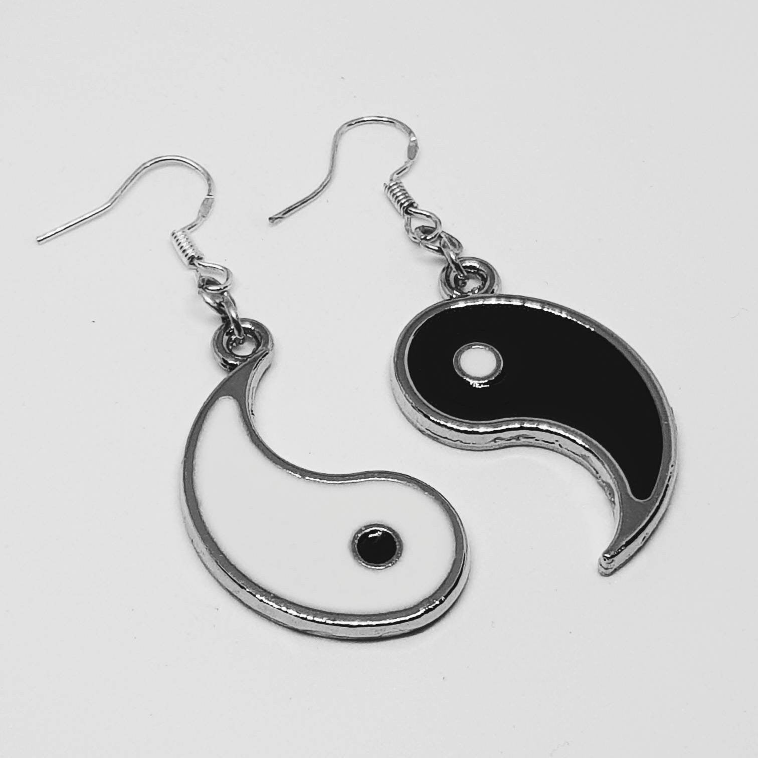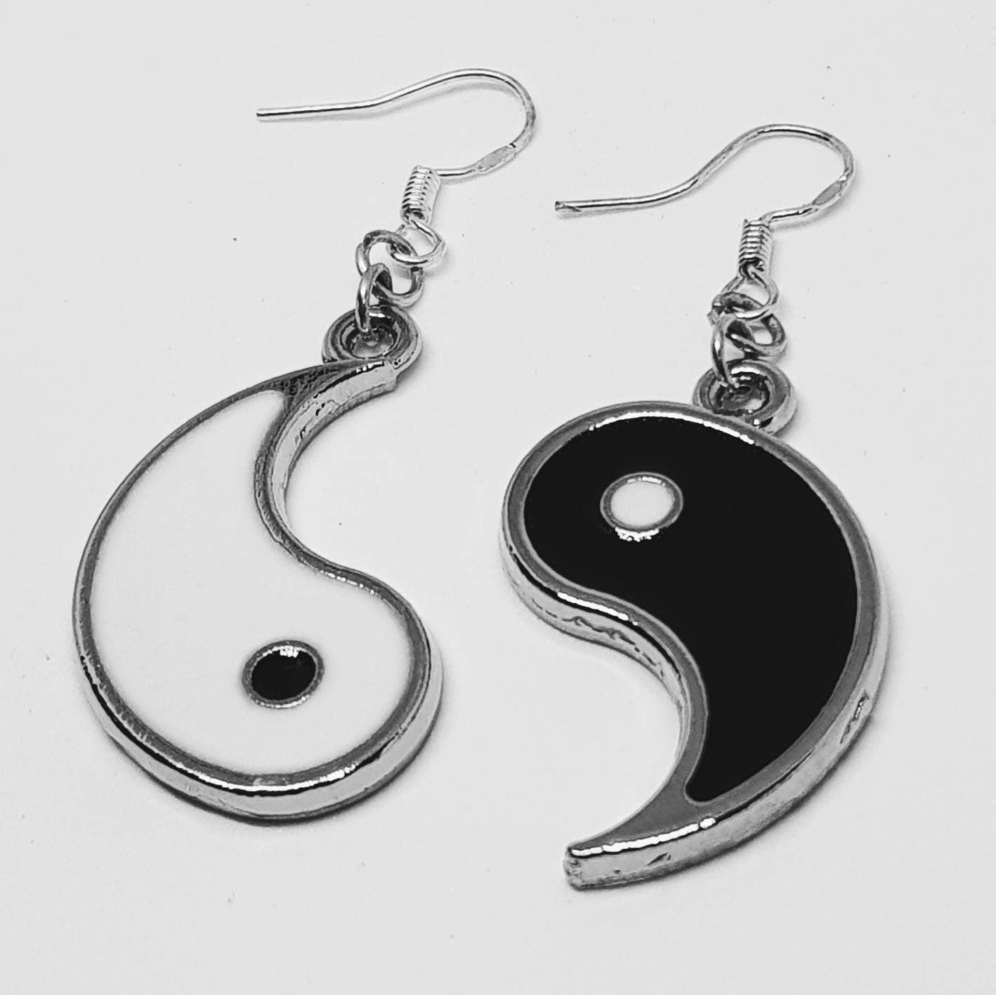 925 Silver Ear Wire or 925 Silver Leverback option Mismatched charm earrings featuring silver plated zinc alloy based yin and yang charms.