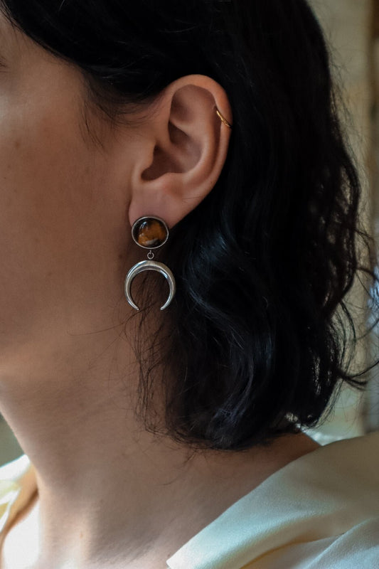 ANUK Boucles d'oreilles à tige en forme d'oeil de tigre, croissant de lune, argent