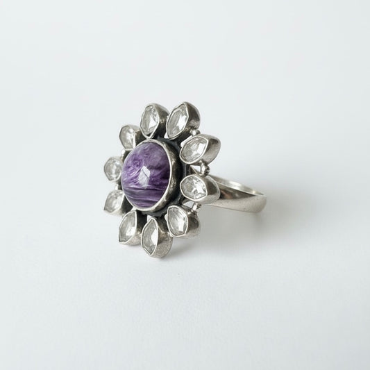 Bague Fleur en Argent avec Charoïte et Diamant Herkimer CELESTIAL BLOOM