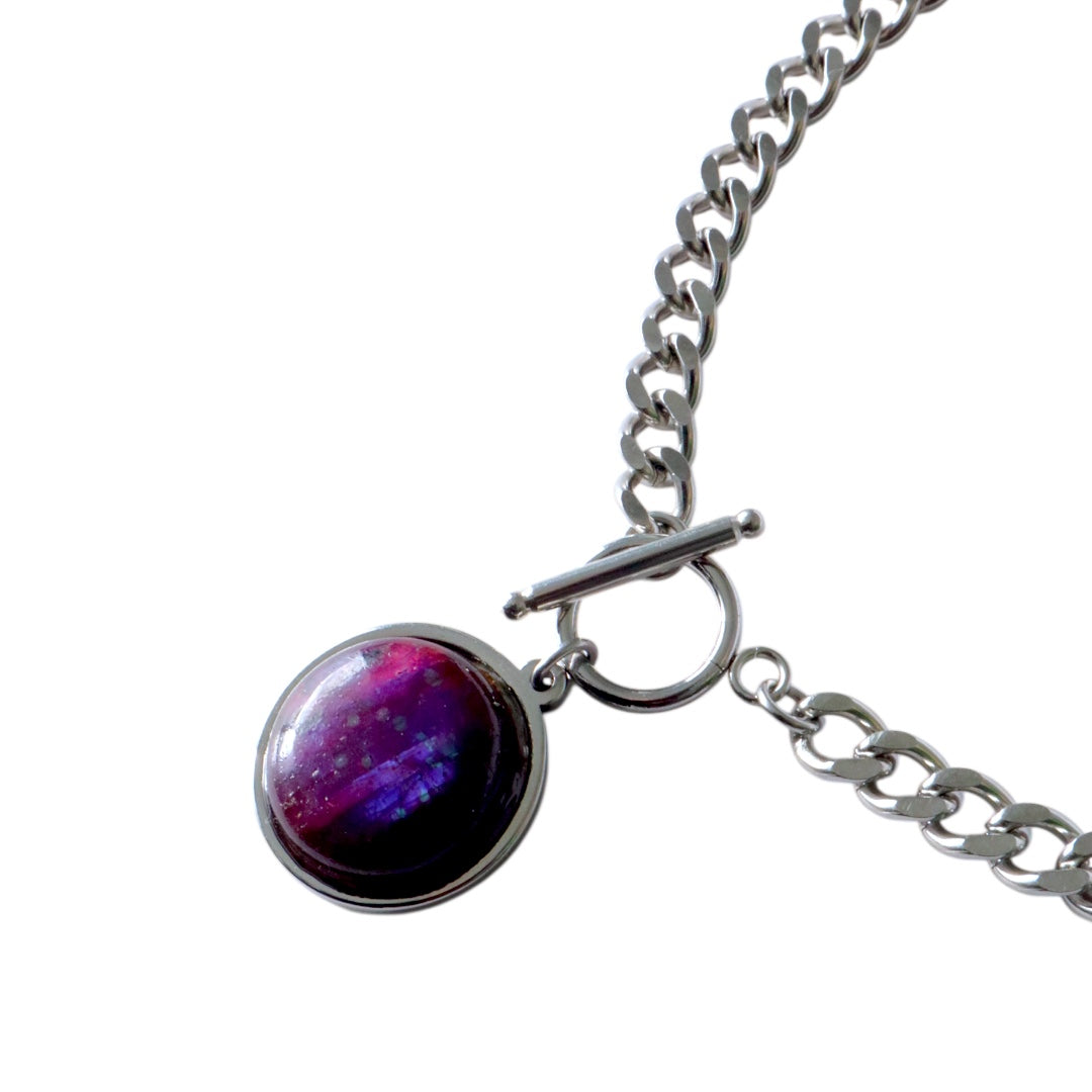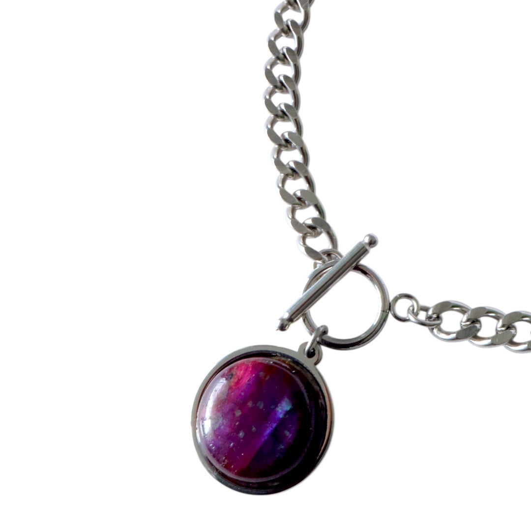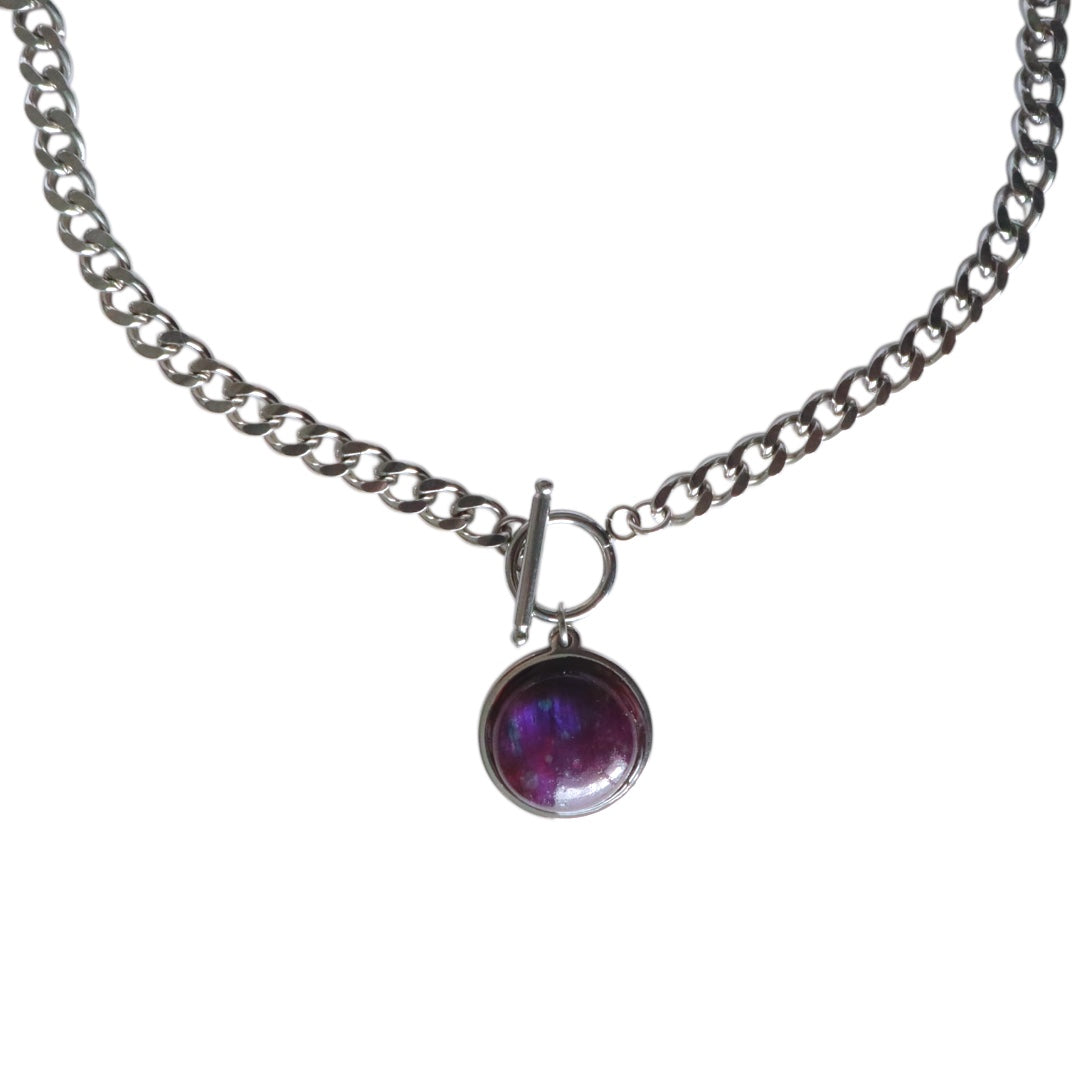 Mystérieux comme le crépuscule et audacieux comme une vérité, ce collier est une affirmation de puissance tranquille. Ancré par une labradorite violette polie de 20 mm, aux reflets violet orageux et argent lunaire, il est suspendu à une chaîne cubaine épaisse qui reflète la lumière à chaque mouvement.