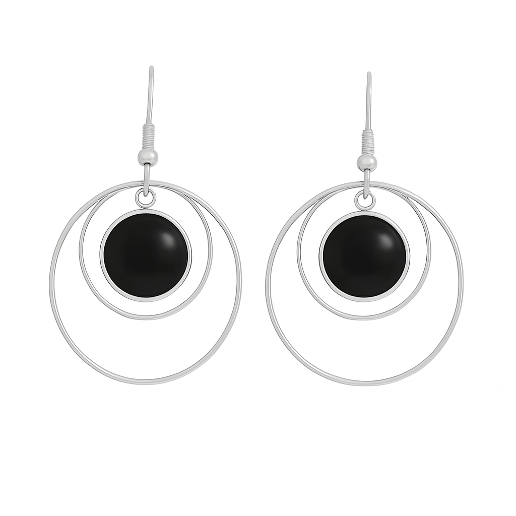 Audacieuses et intemporelles, les créoles ANETHA en onyx noir incarnent force et puissance tranquille. Fabriquées à la main en acier inoxydable avec une finition argent poli, chaque boucle d'oreille encadre une pierre précieuse en onyx noir de 12 mm dans un double anneau élégant, créant un contraste saisissant entre profondeur sombre et éclat radieux. Légères et percutantes, leur fermoir à crochet assure confort et aisance, tandis que leur conception hypoallergénique et étanche garantit une élégance durable.
