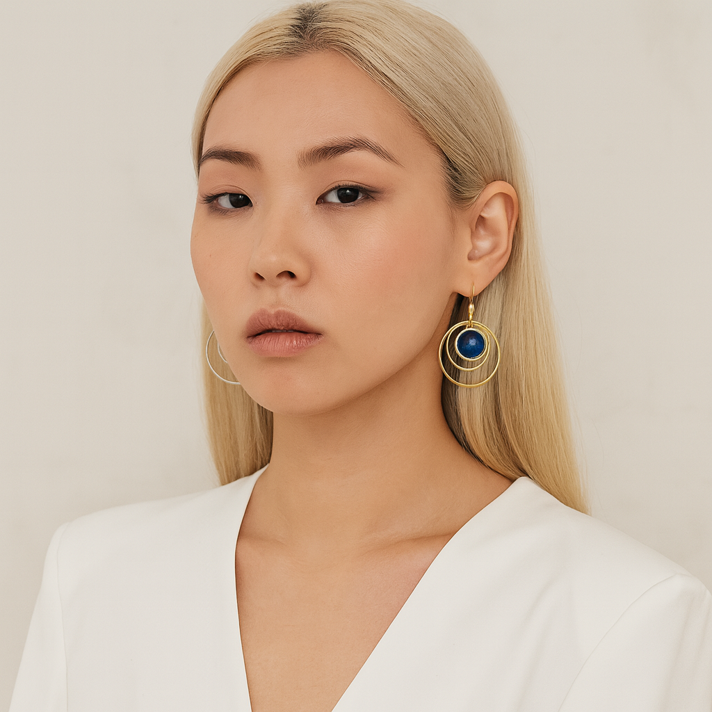 Le lapis-lazuli est vénéré depuis longtemps comme une pierre de vérité et de vision intérieure. Apprécié depuis l'Antiquité pour sa profondeur céleste, il est réputé pour éveiller la clarté, inspirer l'expression sincère et ouvrir l'esprit à une connaissance supérieure. Associées à la forme éternelle de l'anneau, symbole d'unité, de protection et d'infini, les boucles d'oreilles ANETHA deviennent des talismans d'authenticité et de connexion cosmique, véhiculant à la fois parure et amulette dans leur design lumineux.