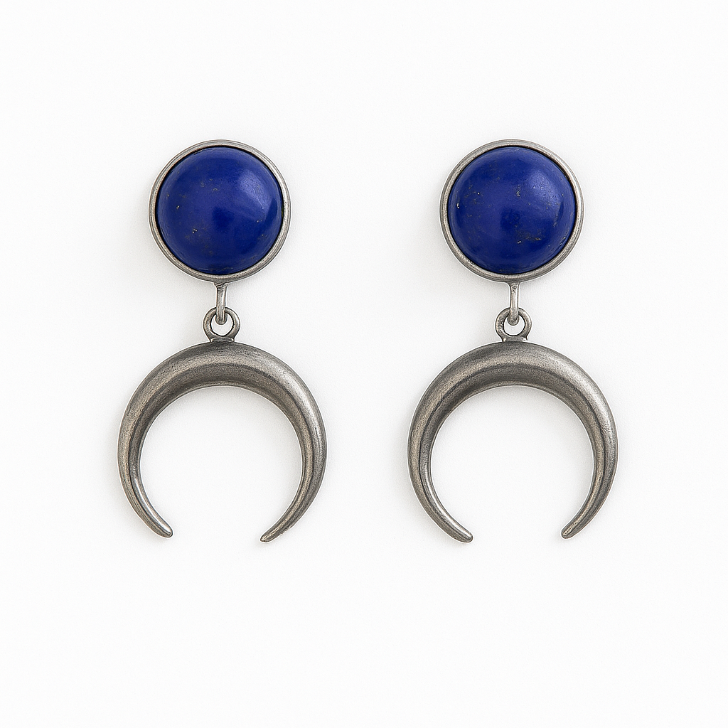 Lunes argentées et profondeur d'un bleu céleste : une ode à la sagesse et à la vérité intérieure. Les boucles d'oreilles Anuk arborent un clou en lapis-lazuli poli, dont la surface s'illumine de teintes nocturnes profondes et de reflets dorés, associé à un pendentif croissant de lune. Ensemble, ils créent un design évoquant les cycles cosmiques et le savoir ancestral, une alliance de pierre et de symbole. Le lapis-lazuli est vénéré comme une pierre de vérité et d'illumination, réputé pour ouvrir l'esprit, approfondir l'intuition et inspirer la clarté spirituelle. Portées de jour comme de nuit, les boucles d'oreilles Anuk expriment présence, vision et élégance.