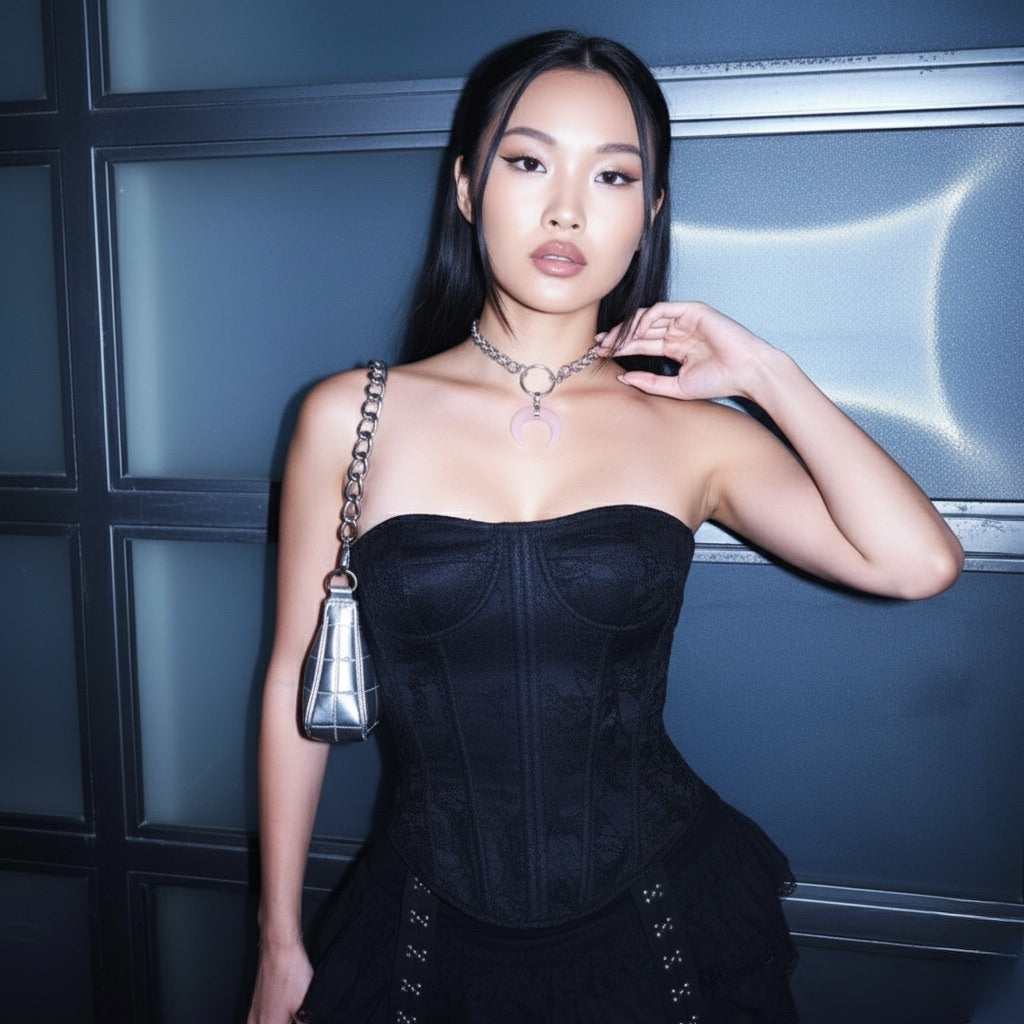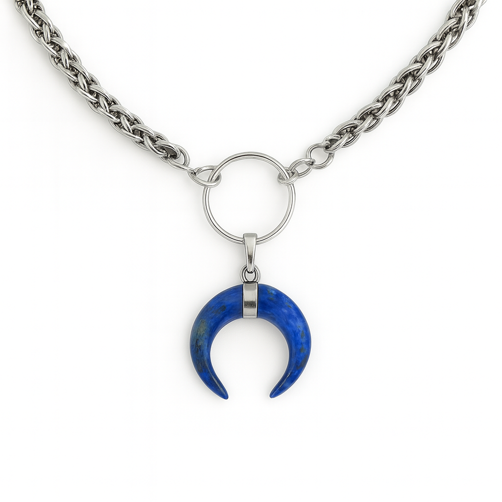 Mystique et imposant, le collier ras-du-cou Aura en lapis-lazuli incarne la vérité, la vision et la force intemporelle. Fabriqué à la main en acier inoxydable avec une finition argent poli, sa chaîne épi de blé de 35 cm est ornée d'un anneau torique audacieux, symbole d'unité et de cycles infinis. Un pendentif amovible en lapis-lazuli en forme de corne y est suspendu, d'un bleu céleste profond parsemé de pyrite dorée, telles des étoiles disséminées dans un ciel de minuit.