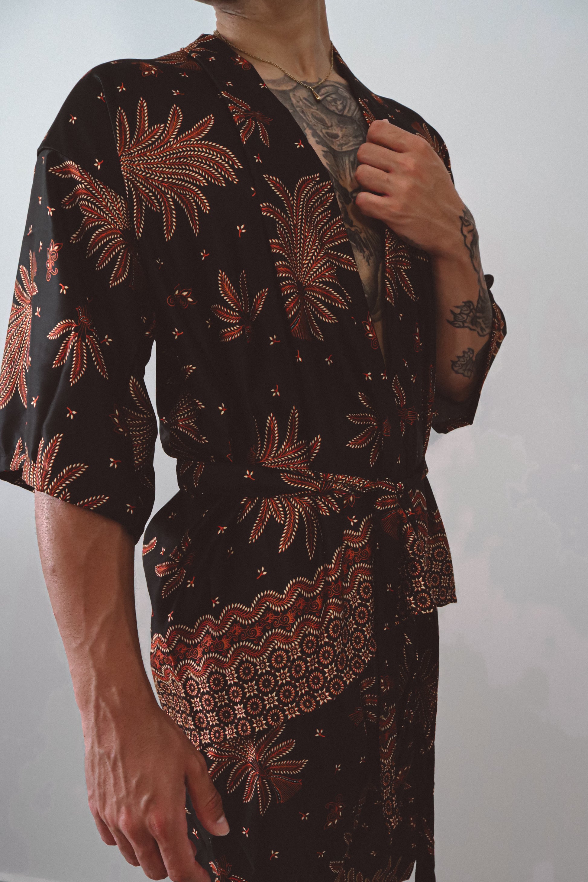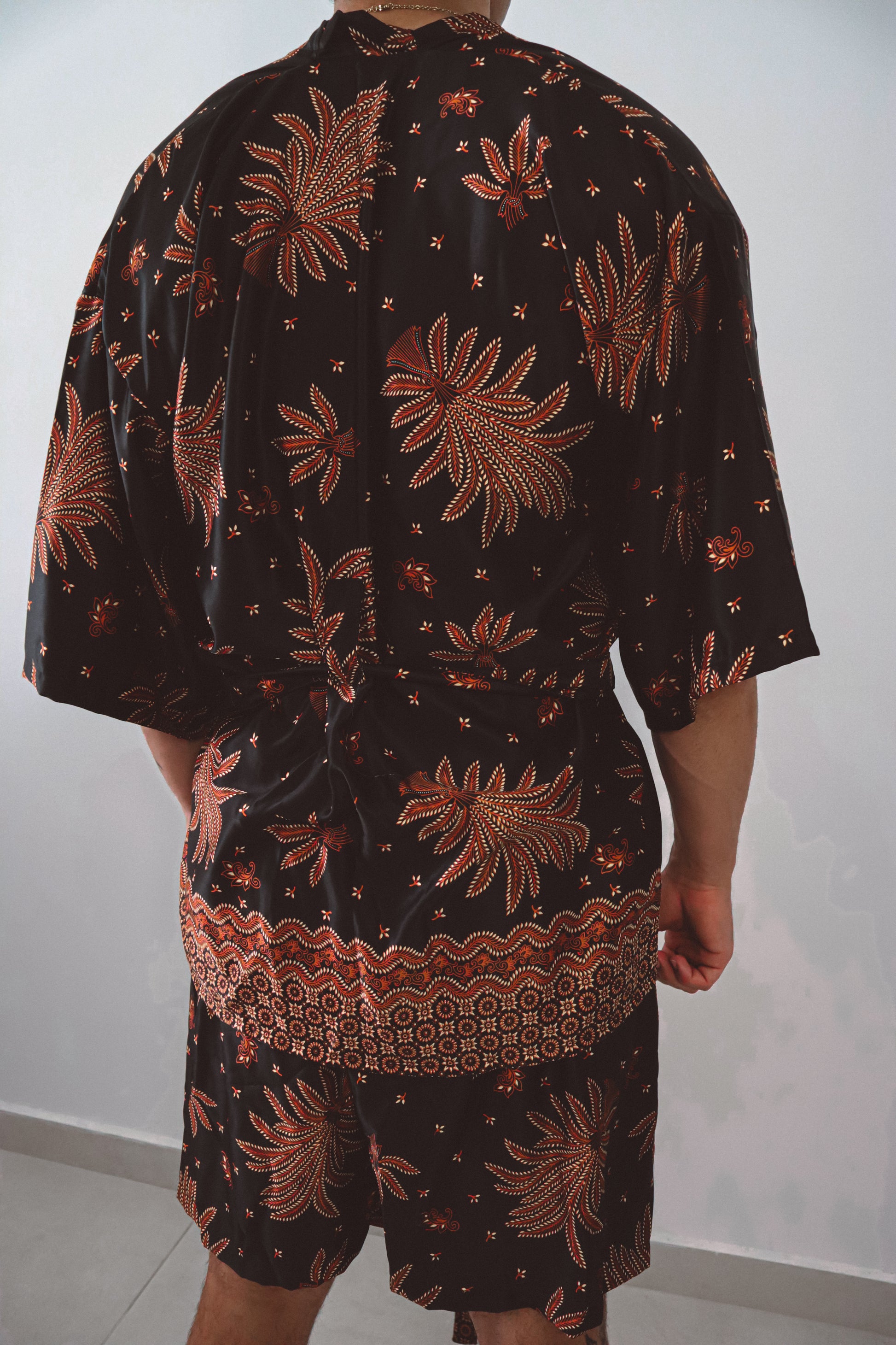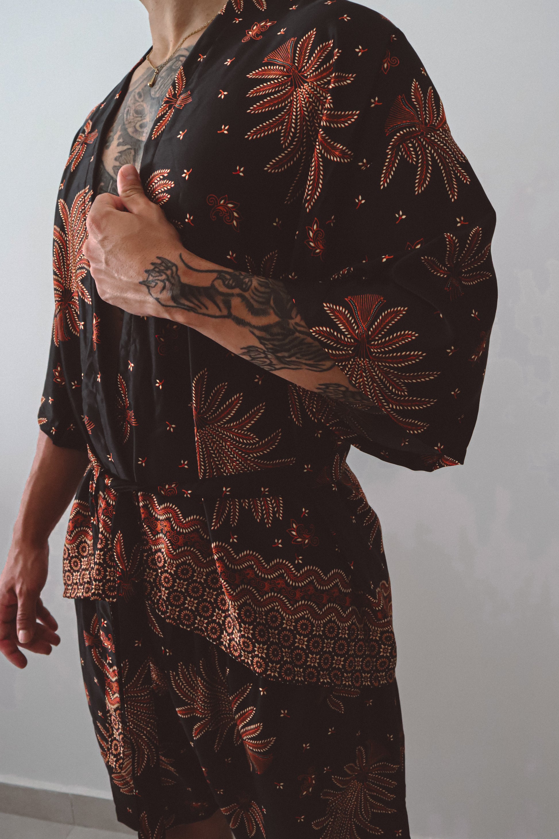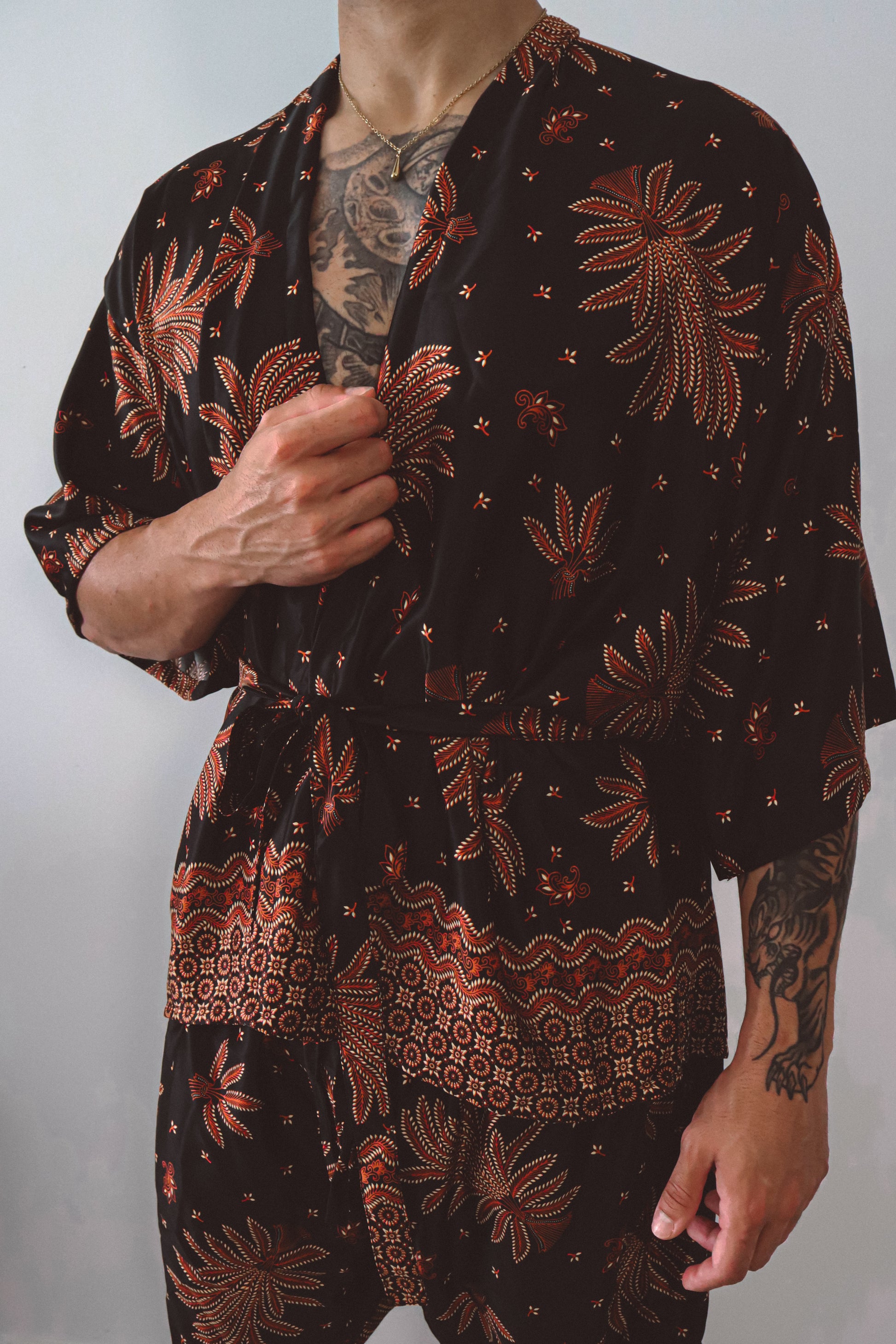 Le kimono ouvert épouse la silhouette avec une subtile sensualité, resserré à volonté par une cravate en soie assortie. Associé à un short ample et décontracté qui reprend la même énergie florale, cet ensemble invite au mouvement, que ce soit pour les rassemblements à l'heure dorée, les célébrations au crépuscule ou les moments de solitude. Inspiré par la puissance symbolique du lotus surgissant de l'obscurité, cet ensemble rayonne de confiance et de profondeur.