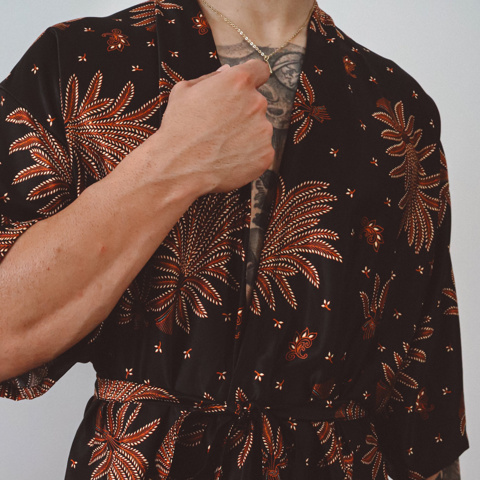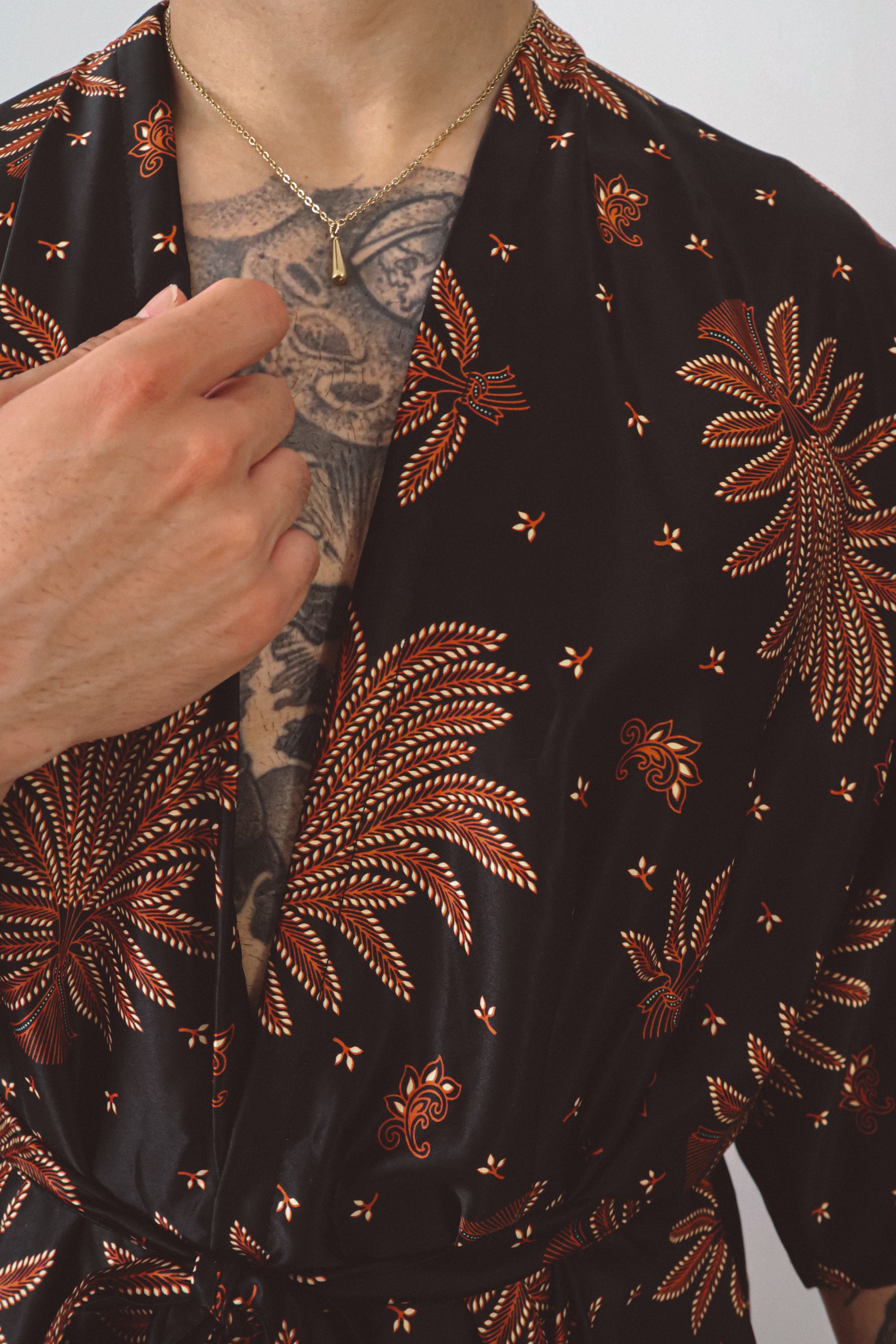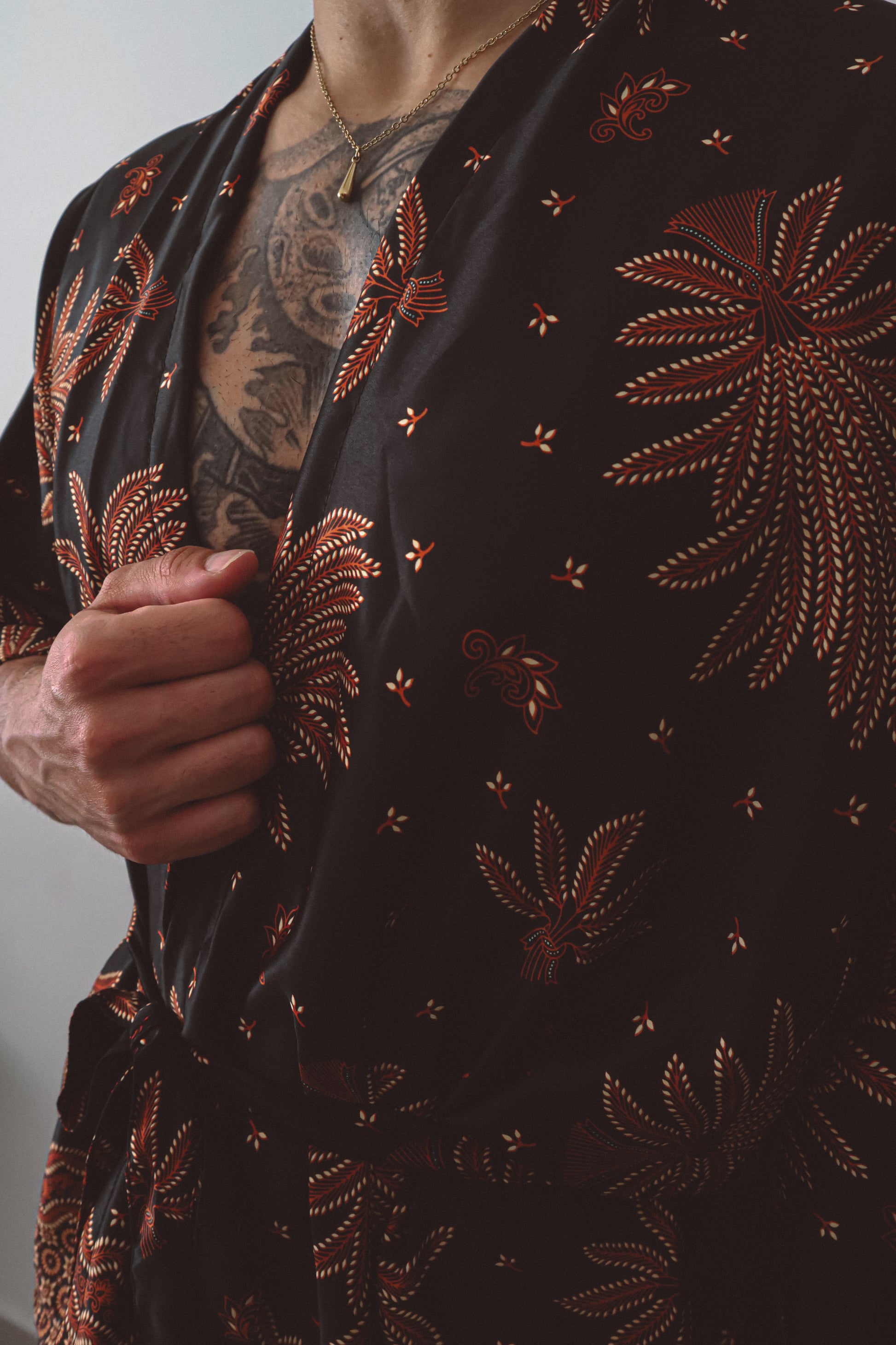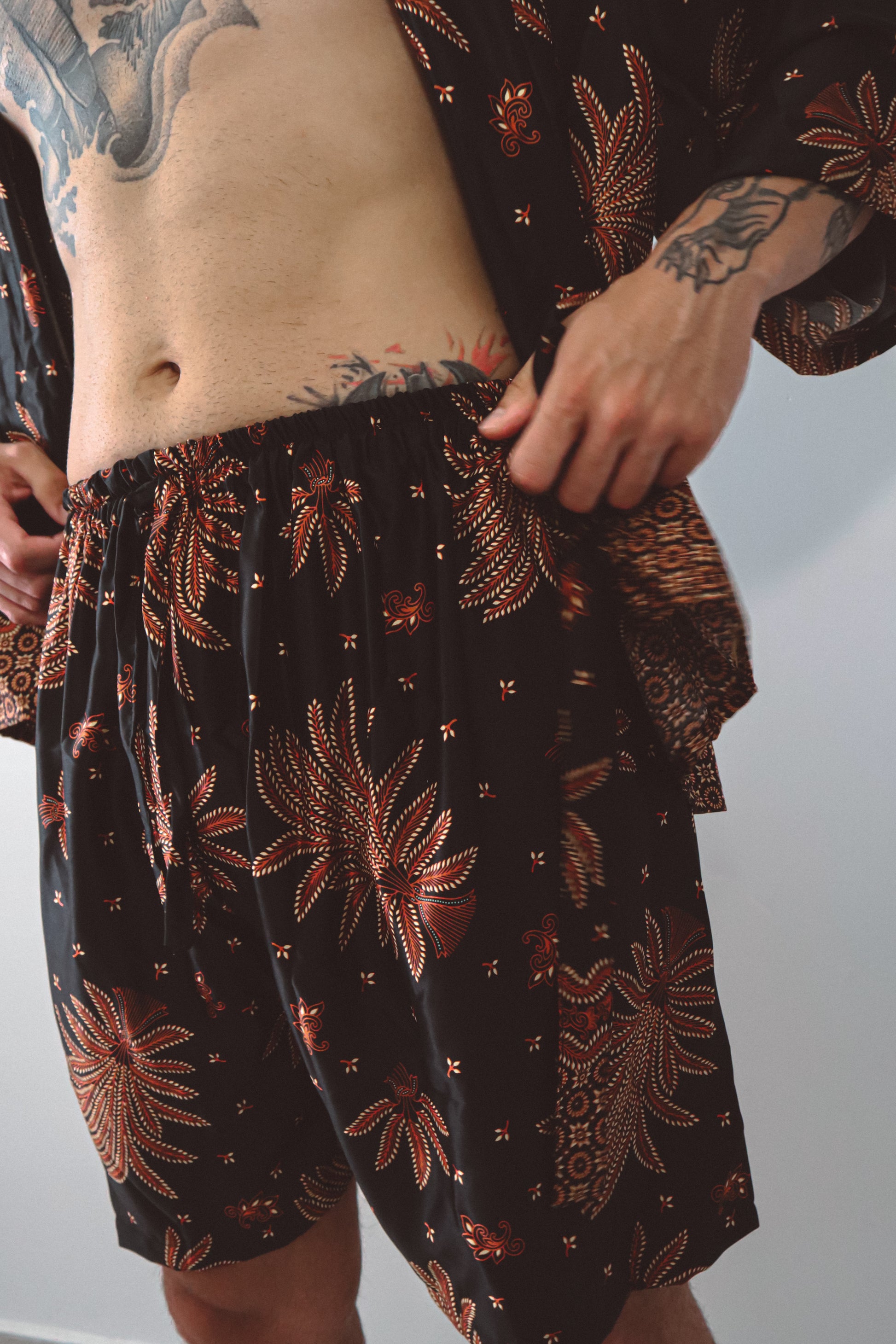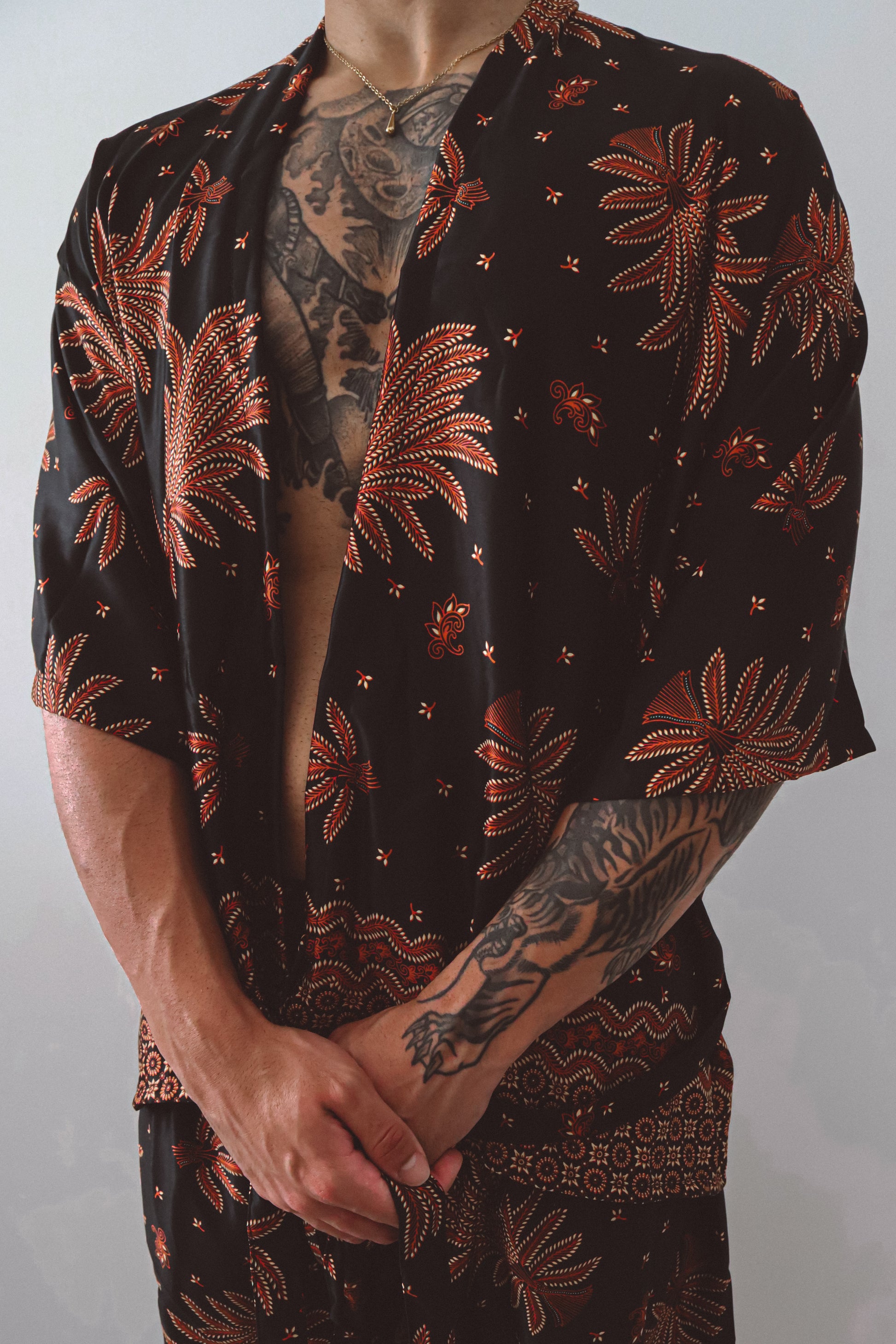 Le kimono ouvert épouse la silhouette avec une subtile sensualité, resserré à volonté par une cravate en soie assortie. Associé à un short ample et décontracté qui reprend la même énergie florale, cet ensemble invite au mouvement, que ce soit pour les rassemblements à l'heure dorée, les célébrations au crépuscule ou les moments de solitude. Inspiré par la puissance symbolique du lotus surgissant de l'obscurité, cet ensemble rayonne de confiance et de profondeur.