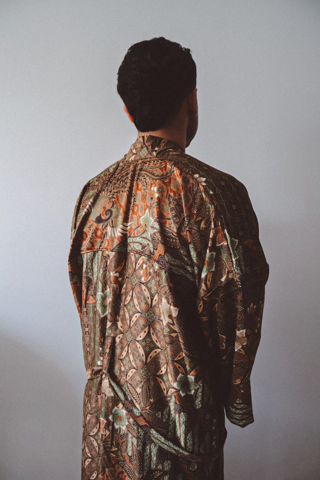 Design sophistiqué : Kimono long fabriqué à la main, orné d'un mélange vibrant d'imprimés marron, doré, orange et vert, dégageant une touche terreuse et luxueuse.