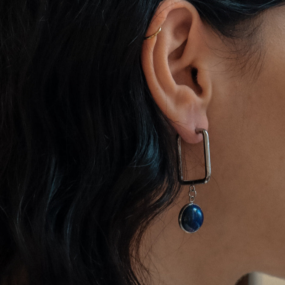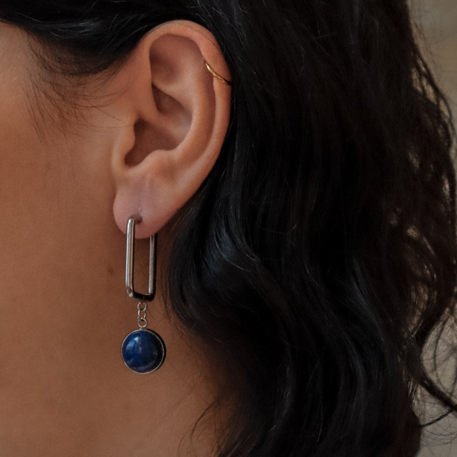 La géométrie moderne rencontre la sagesse ancestrale dans les boucles d'oreilles Carré. Un lapis-lazuli poli, réputé pour sa profondeur d'un bleu céleste et ses reflets dorés, est suspendu à une élégante créole rectangulaire. Son scintillement discret et sa résonance symbolique de vérité, de clarté et de paix intérieure font de cette pièce plus qu'une parure : c'est un talisman de sagesse et de présence. Conçues pour évoluer avec grâce du jour à la nuit, les boucles d'oreilles Carré incarnent à la fois élégance et sens. Fabriquées à la main à Malte, elles allient design contemporain et énergie intemporelle.