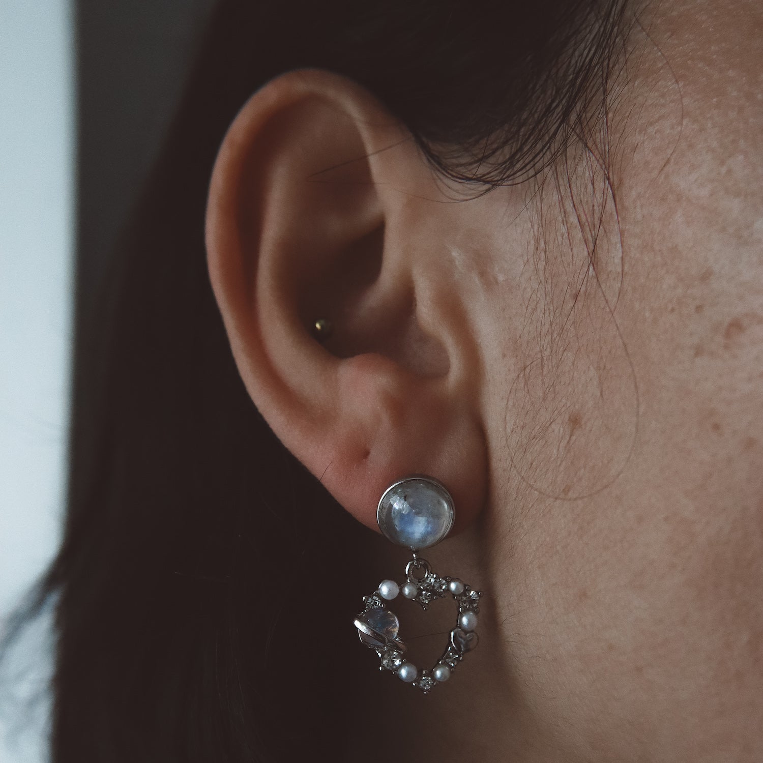 Une fusion onirique d'énergie cosmique et de symbolisme romantique. Une pierre de lune arc-en-ciel polie ancre chaque boucle d'oreille, rayonnant de magie lunaire et d'intuition. En dessous, un charm en forme de cœur orné d'une minuscule planète annelée, de faux zircons scintillants et de délicates fausses perles – un hommage à l'attraction cosmique et aux merveilles célestes de l'amour.