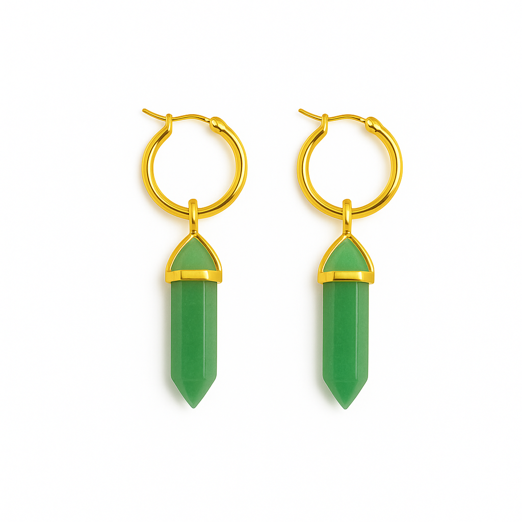 L'aventurine verte est célébrée comme la pierre des opportunités et de l'abondance. On dit qu'elle attire la prospérité, nourrit l'optimisme et rétablit l'équilibre, et qu'elle véhicule l'esprit de croissance et de renouveau. Associées à la forme éternelle de l'anneau, symbole d'unité, de plénitude et de cycles infinis, les boucles d'oreilles Cercle deviennent à la fois un ornement et un talisman, emblèmes de résilience et de renouveau.