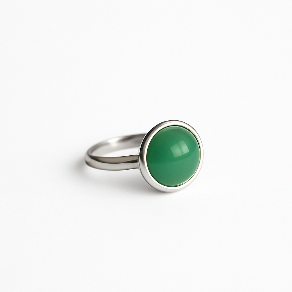 Gardienne discrète de la croissance et du renouveau, la bague Chhota en aventurine verte est un modèle minimaliste à la profondeur significative. En son centre repose une pierre précieuse polie de 1,2 cm d'un vert mousse délicat, vibrante d'un éclat subtil et d'une énergie apaisante. Sertie d'un élégant anneau réglable en acier inoxydable argenté, elle allie simplicité et symbolisme, façonnée comme un talisman du quotidien, symbole de possibilités.