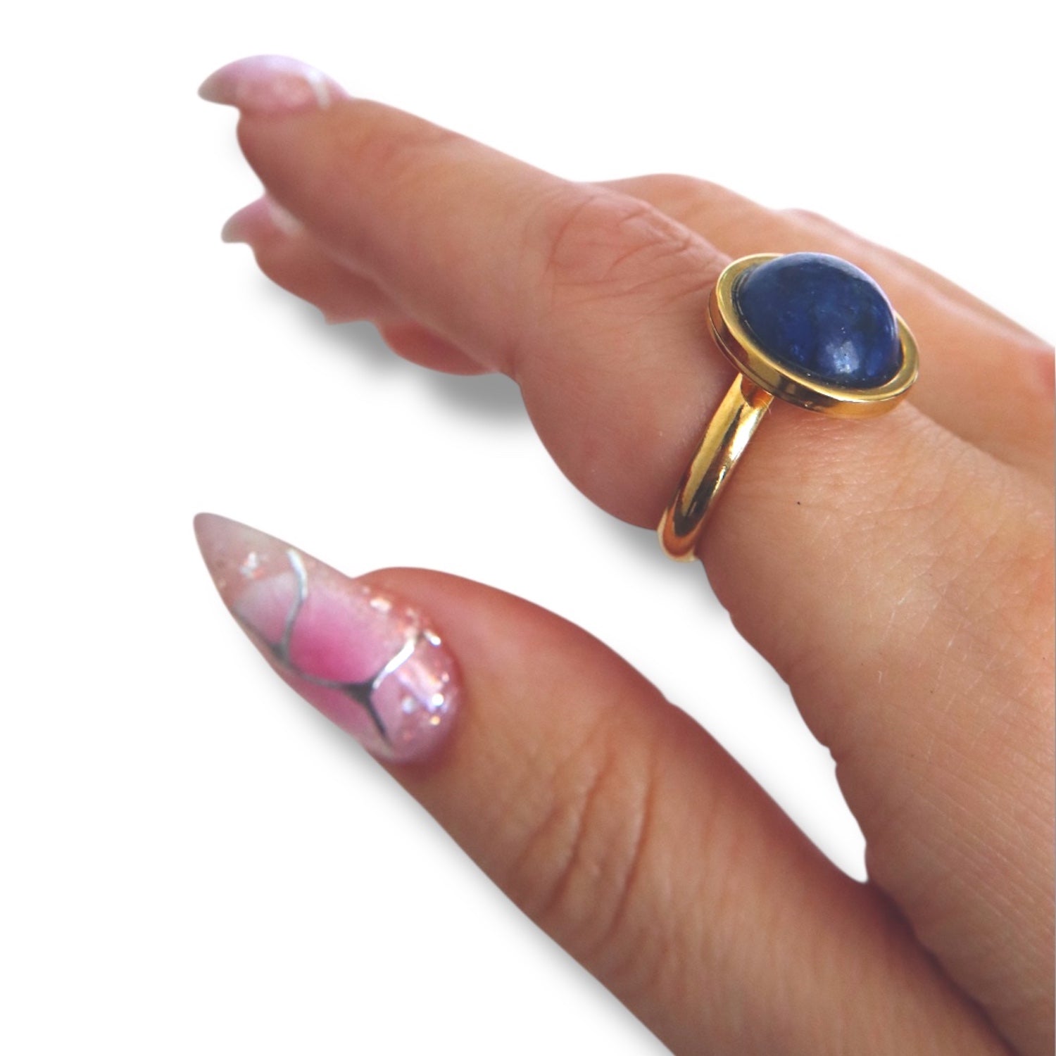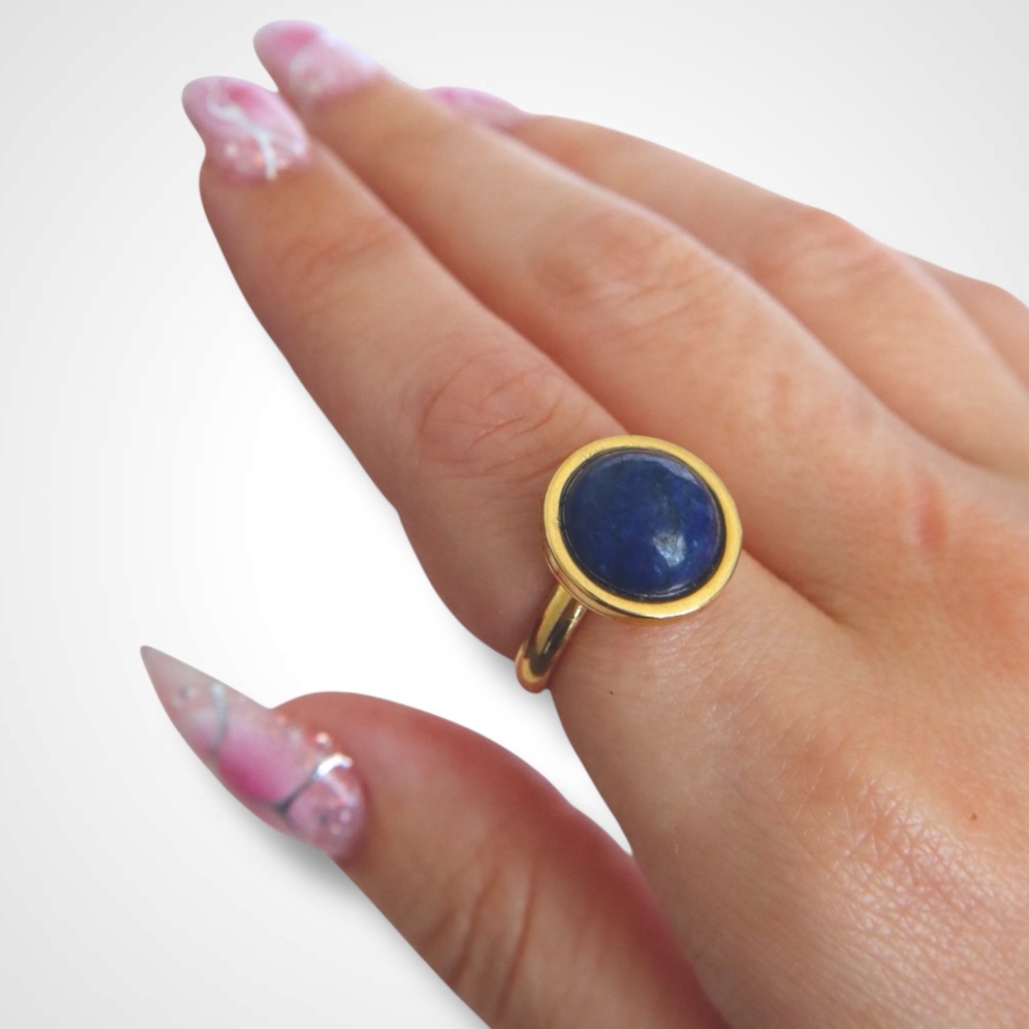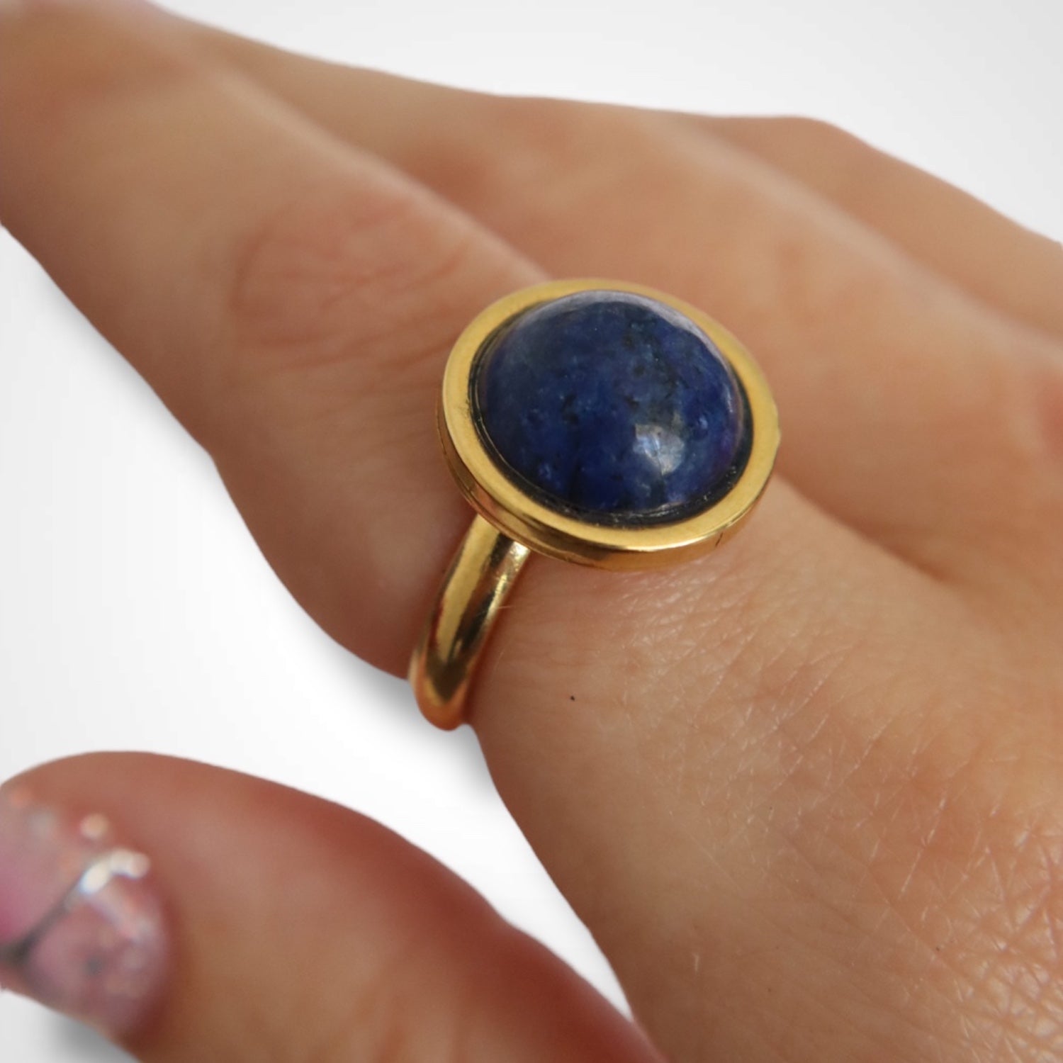 Tel un fragment du ciel nocturne, cette bague minimaliste est ornée d'une pierre ronde en lapis-lazuli qui reflète le profond mystère du cosmos. Avec son mélange céleste de bleu marine, de gris, d'argent et de blanc, chaque pierre précieuse évoque la sagesse ancestrale et la vérité intérieure. Le lapis-lazuli est reconnu pour favoriser la clarté, encourager l'expression de soi et approfondir la spiritualité. Ajustable et unique, chaque pièce est fabriquée à la main dans notre atelier à Malte, conçue pour ceux qui portent l'univers en eux.