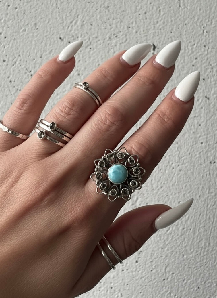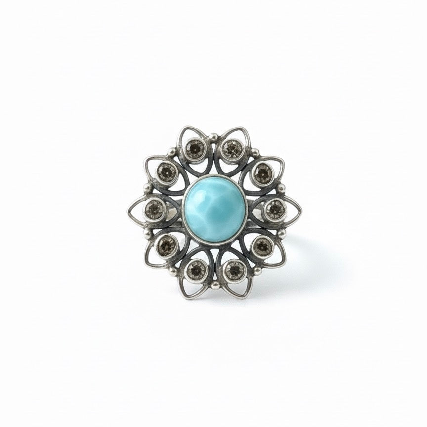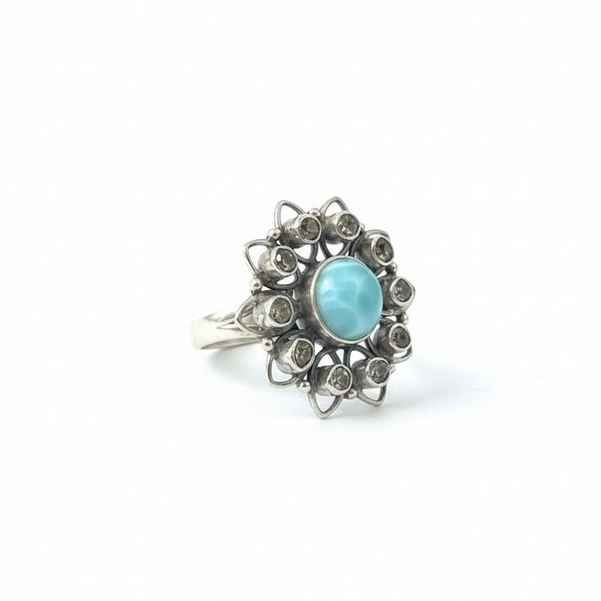 La bague DOMINICA Flower est ornée d'un larimar poli, originaire de République dominicaine, réputé pour ses motifs bleu ciel et son énergie apaisante. Dix diamants Herkimer bruts, sélectionnés à la main pour leur pureté naturelle, entourent le larimar et forment un motif floral captivant. Montée sur de l'argent sterling 925 massif, cette bague allie élégance et durabilité. Ses dimensions d'environ 2,5 cm x 2,5 cm en font une pièce remarquable, symbole d'harmonie, de force et de renouveau.