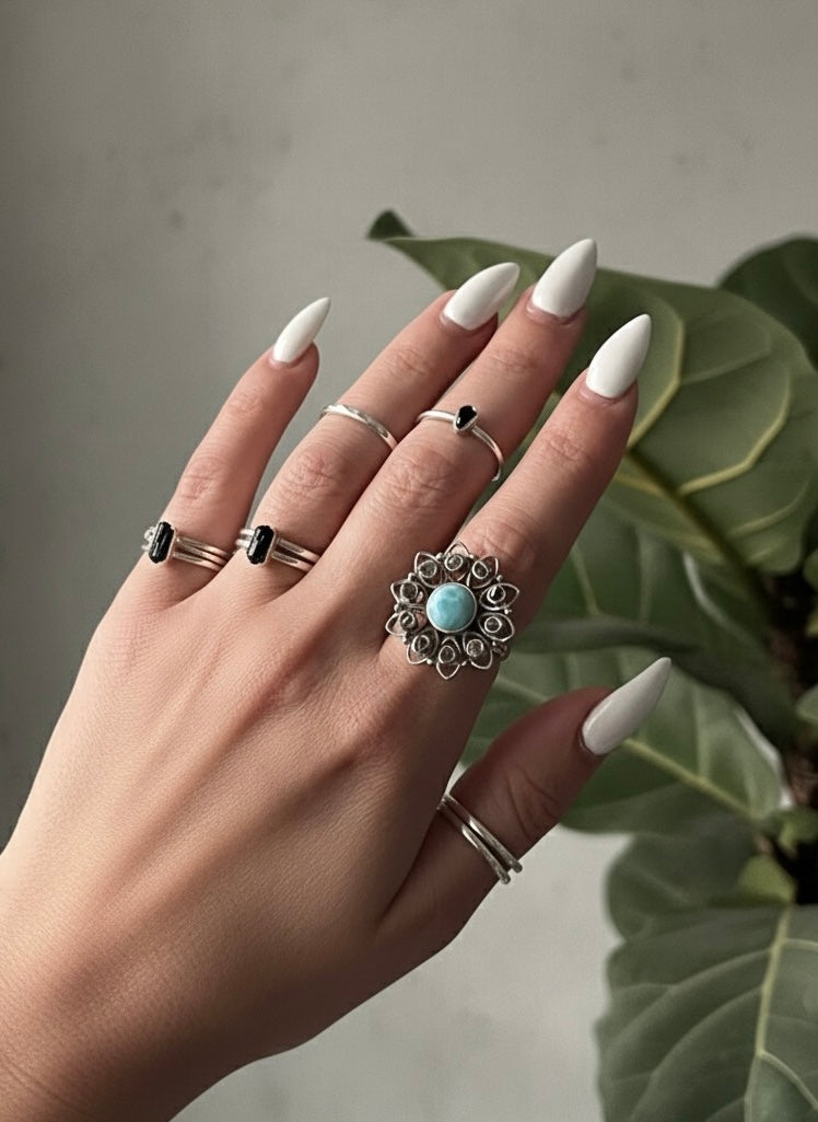 Née de l'océan et de la lumière, cette bague porte en elle l'âme des Caraïbes. Un larimar poli, serein comme les eaux tropicales, repose en son centre ; ses bleus apaisants reflètent la paix et la connexion divine. Tout autour, des diamants Herkimer bruts s'épanouissent tels des pétales radieux, leur éclat indompté capturant la beauté de la croissance et des nouveaux commencements. Ensemble, ils forment une fleur qui murmure le renouveau, la beauté et la douce puissance de la nature.