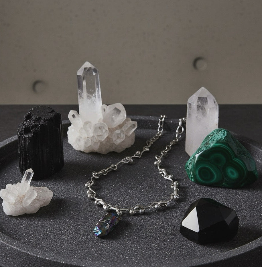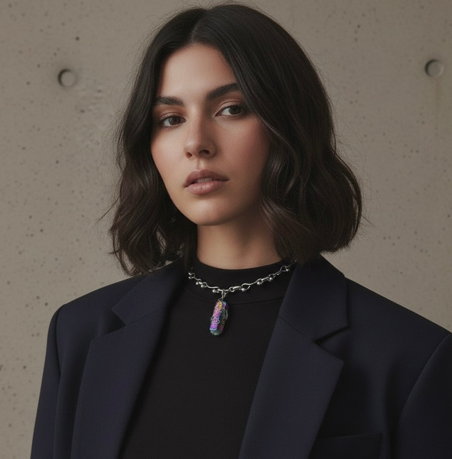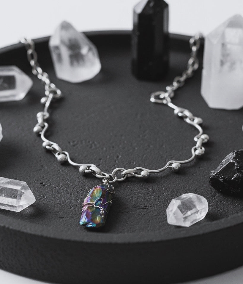 Ionis canalise la pulsation brute de l'énergie et de la lumière. Une pointe de quartz titane naturel, vibrante d'éclats changeants de bleu, de violet et d'or, est suspendue à une chaîne sculpturale en acier inoxydable qui se meut tel un courant. Sa surface irisée reflète la transformation et la force, rappelant la résilience forgée par le changement.