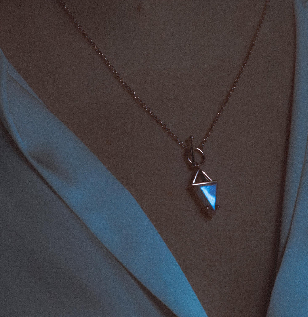 Pierre de Lune : La pièce maîtresse présente une captivante Pierre de Lune, connue pour ses propriétés mystiques. La pierre mesure 15x10 mm et présente une forme taillée au crayon, mettant en valeur une teinte blanche.