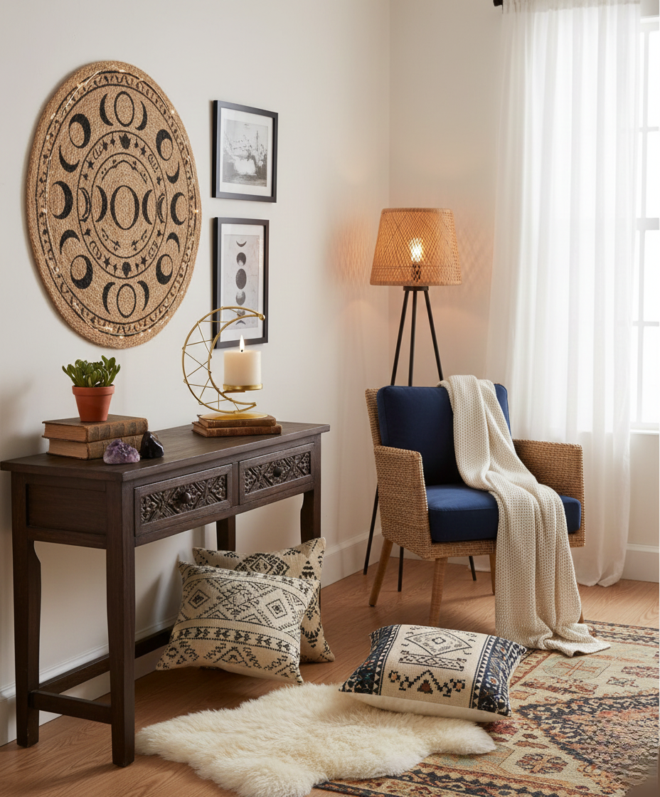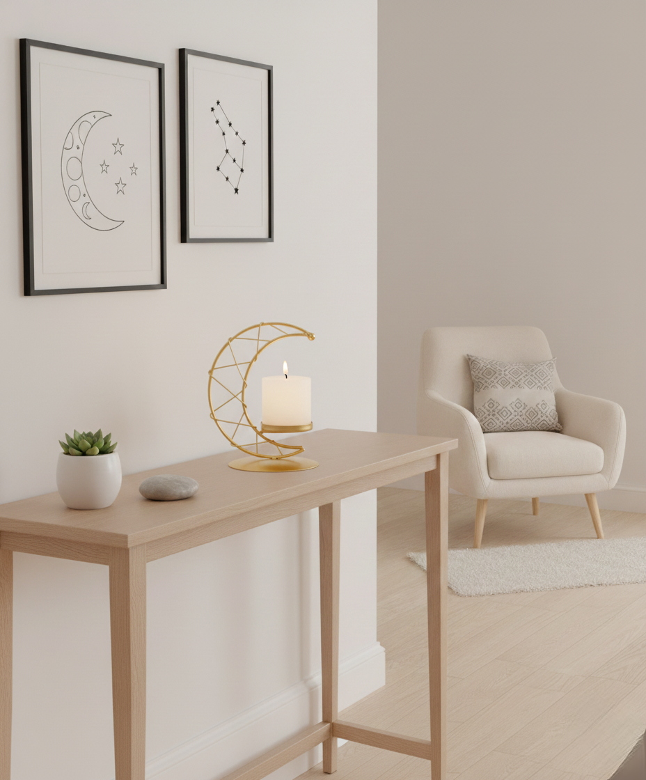Handmade crescent moon candle holder featuring a matching tealight candle cup, designed as a modern decorative accent for home interiors and special occasions.