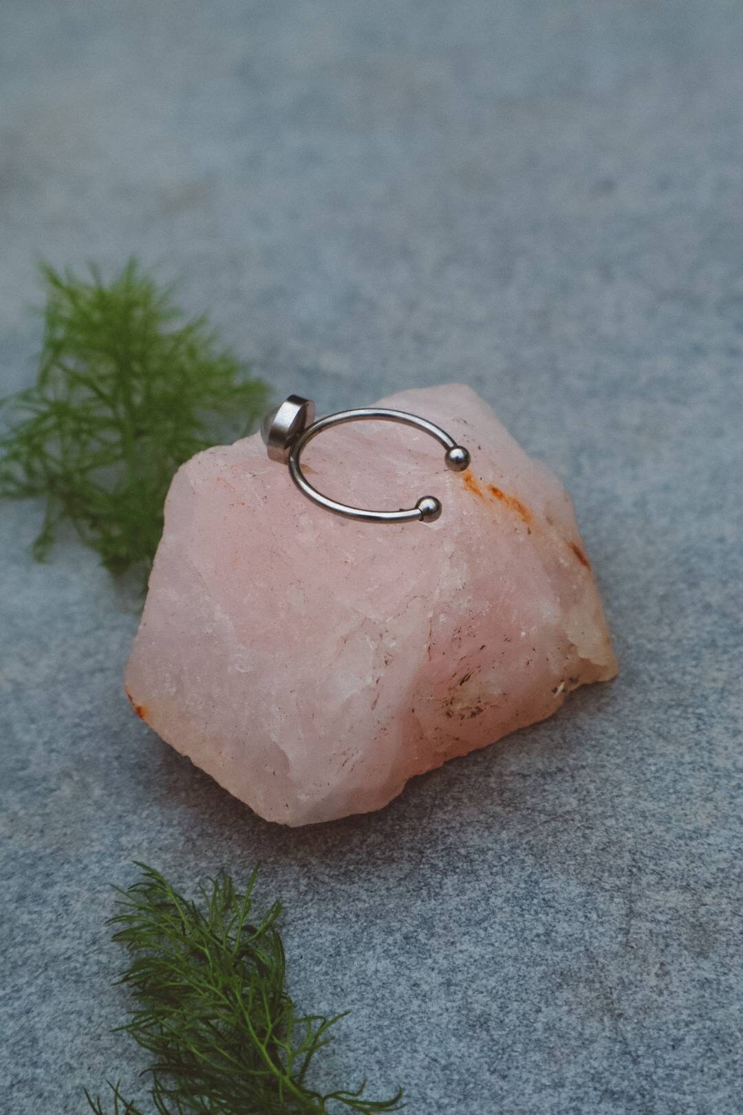 Une délicate bague en cristal en acier inoxydable argenté avec un anneau réglable.