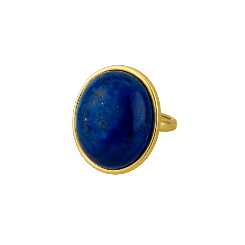 Audacieuse et intemporelle, la bague AYA est un hommage à la vision intérieure et à la vérité. En son centre se trouve un lapis-lazuli poli, aux reflets bleus célestes et aux reflets dorés qui rappellent le ciel nocturne. Pierre de sagesse et d'expression personnelle, le lapis-lazuli est réputé pour éveiller la clarté, la confiance et une communication plus profonde, guidant celui qui le porte vers l'authenticité et la perspicacité. Montée sur un acier inoxydable doré éclatant et dotée d'un élégant anneau réglable, cette bague imposante incarne à la fois force et élégance. Fabriquée à la main dans notre atelier à Malte, elle est conçue pour ceux qui portent du sens dans leurs bijoux et de la lumière dans leur présence.