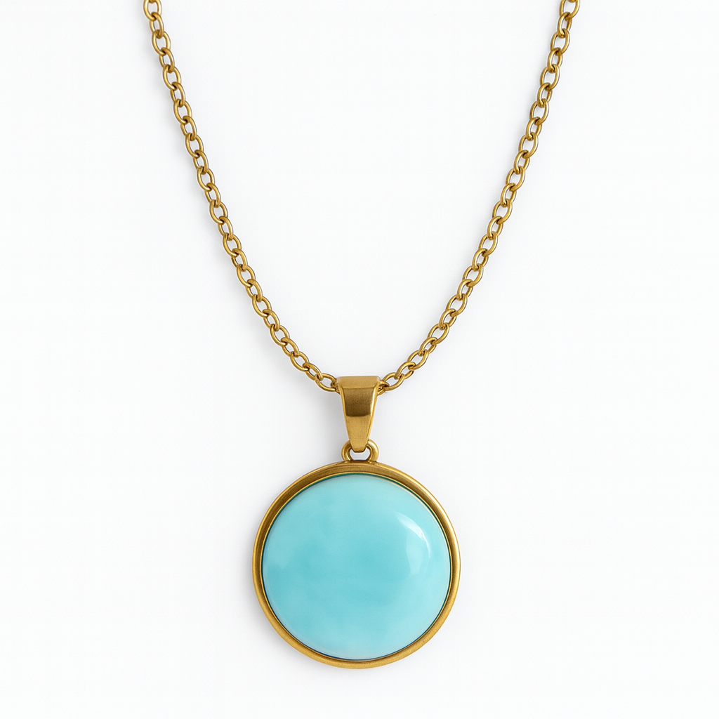 Présentation de notre collier fait main avec la pierre Larimar à couper le souffle. La pierre est absolument magnifique, ressemblant à de douces ondulations de la mer et a une taille de 20 mm, ronde et polie pour une finition impeccable. Il est serti dans un pendentif en acier inoxydable de haute qualité disponible en finitions or ou argent.