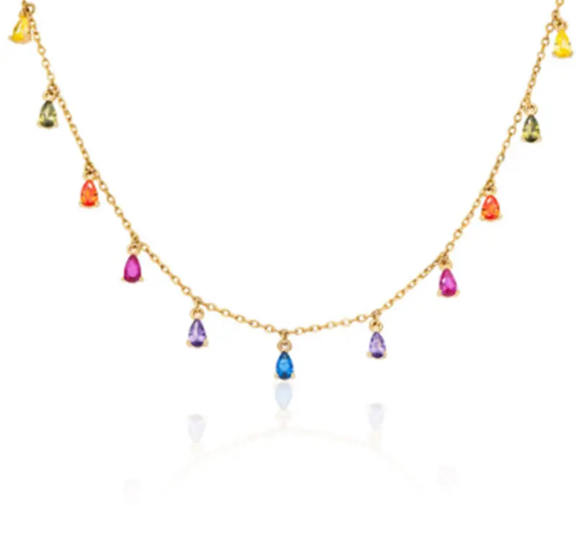 Notre collier Rainbow Drop est doté d'une chaîne et de montures en argent 925 plaqué or 18 carats, garantissant à la fois style et durabilité. Le placage en or ajoute une touche de luxe et complète magnifiquement les couleurs vibrantes des pierres précieuses en zircone cubique synthétique.
