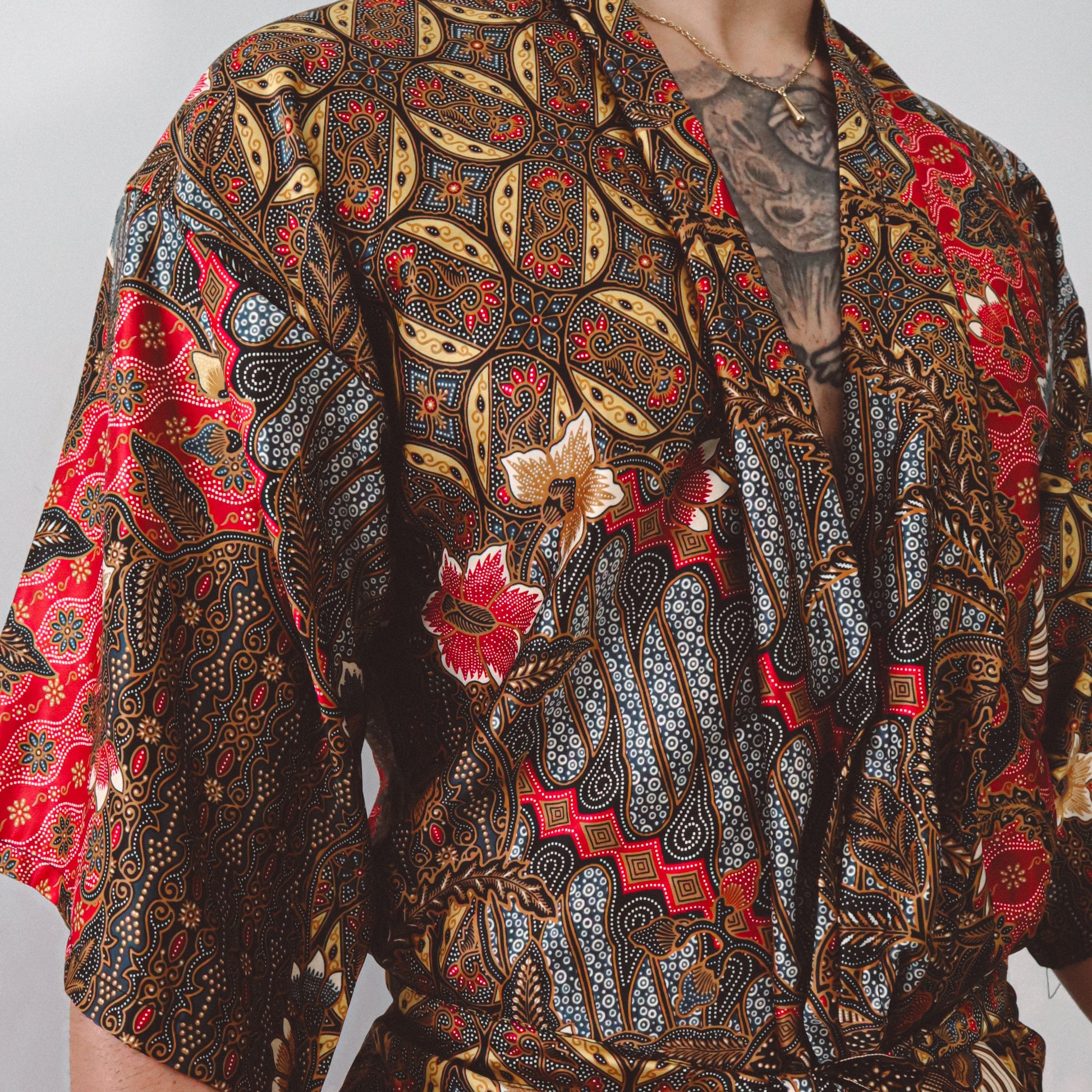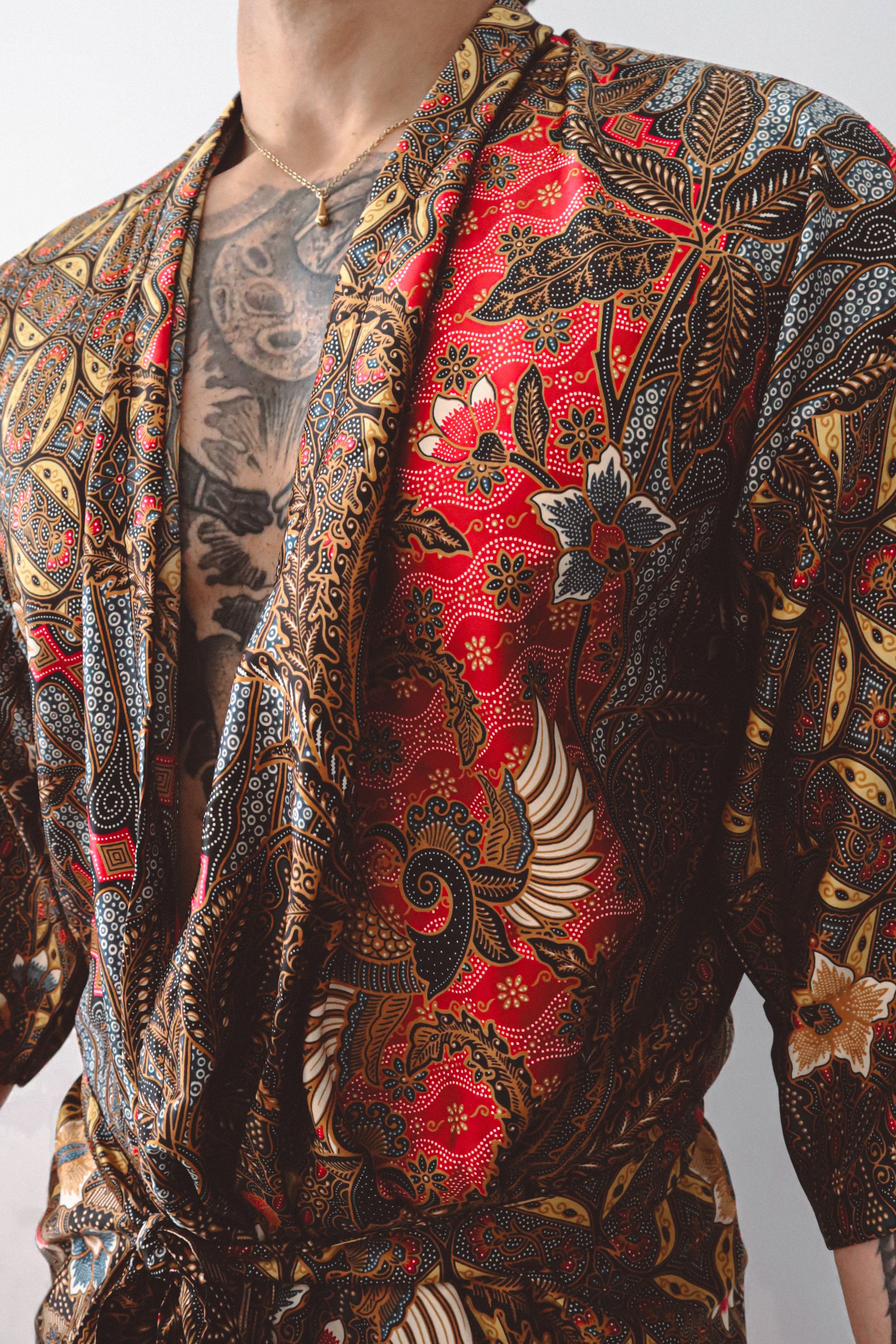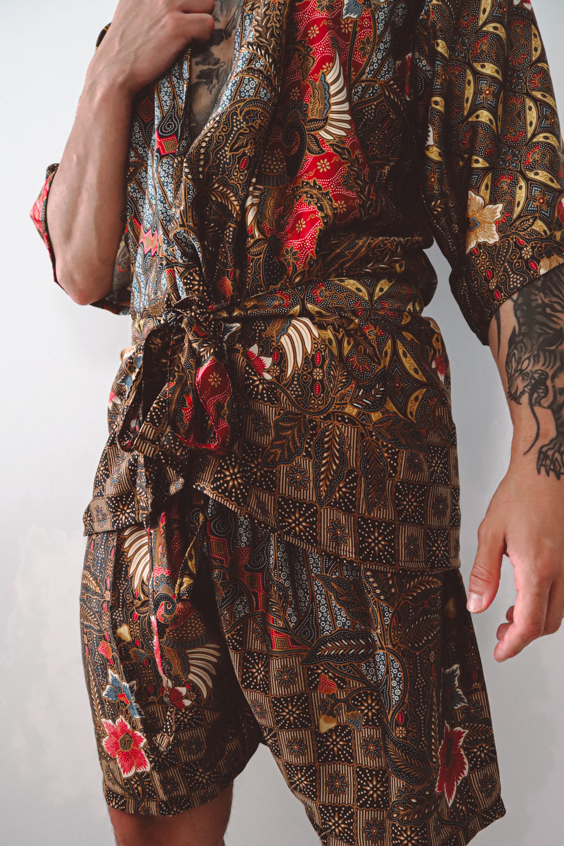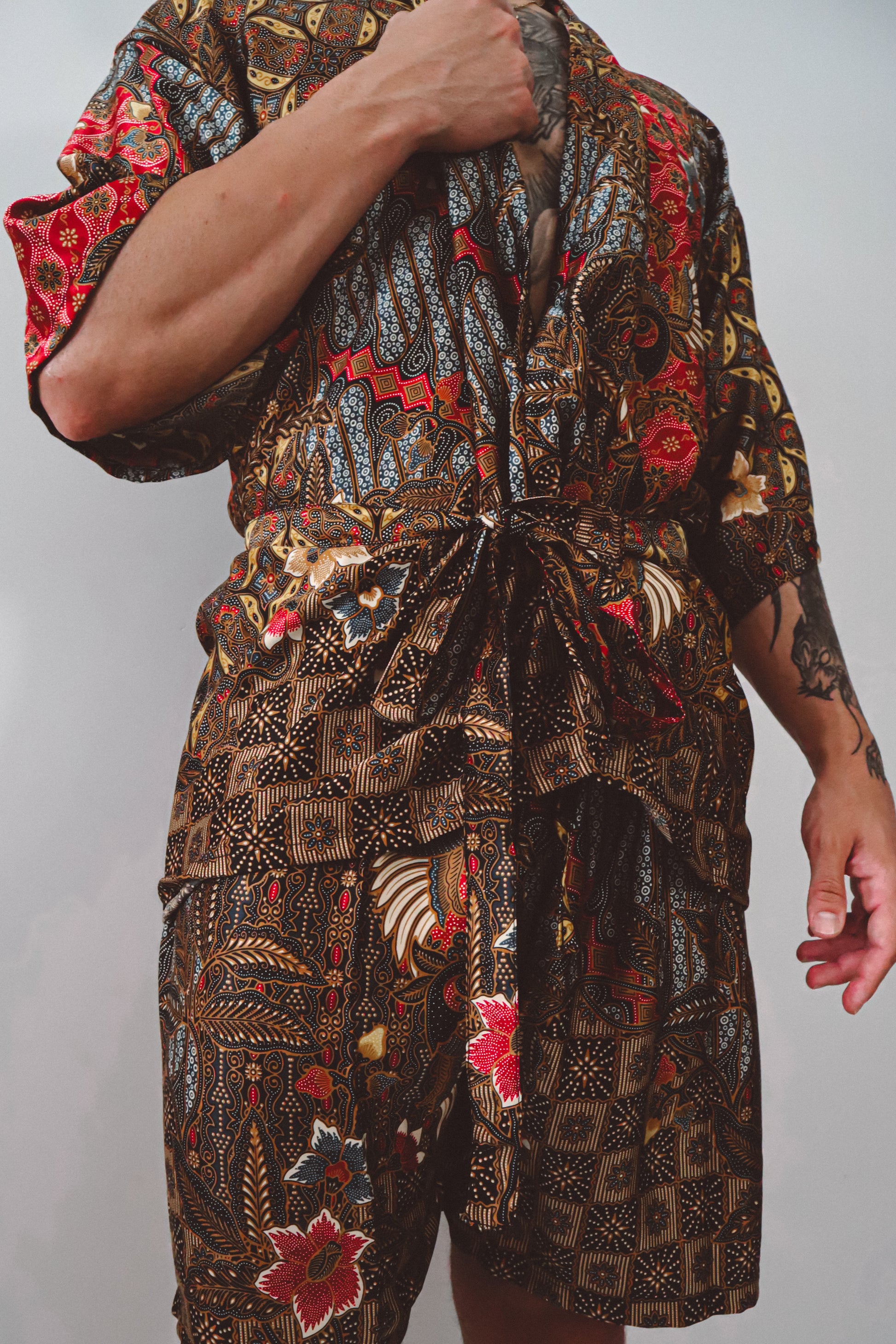 Fusion audacieuse de tradition et d'audace, cet ensemble kimono et short fait main captive l'attention avec sa base en soie noire profonde, rehaussée de détails floraux rouge vif, jaune soleil et bleu électrique. Conçu pour ceux qui vivent et s'habillent avec audace, cet ensemble incarne force intérieure, passion et liberté d'esprit.