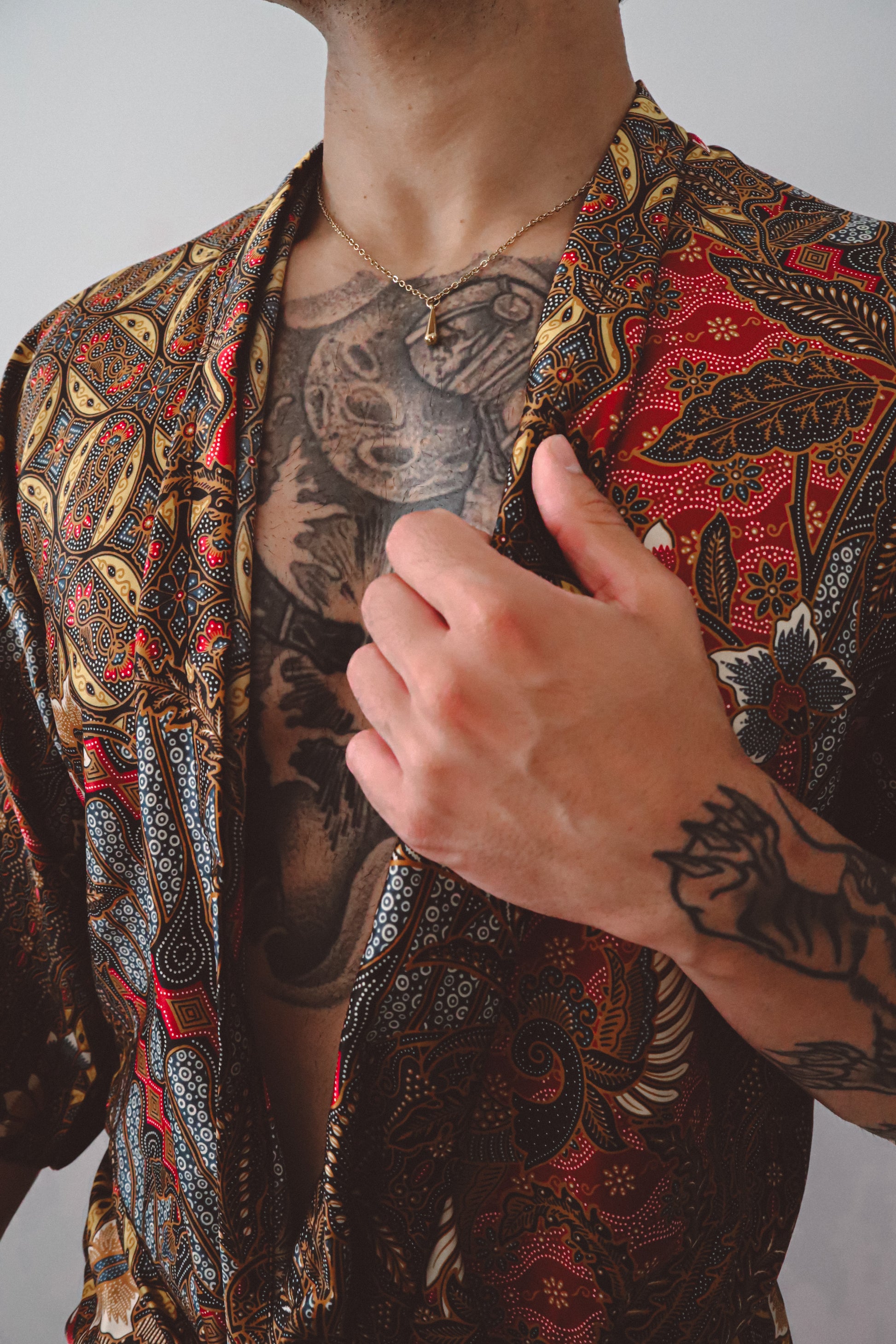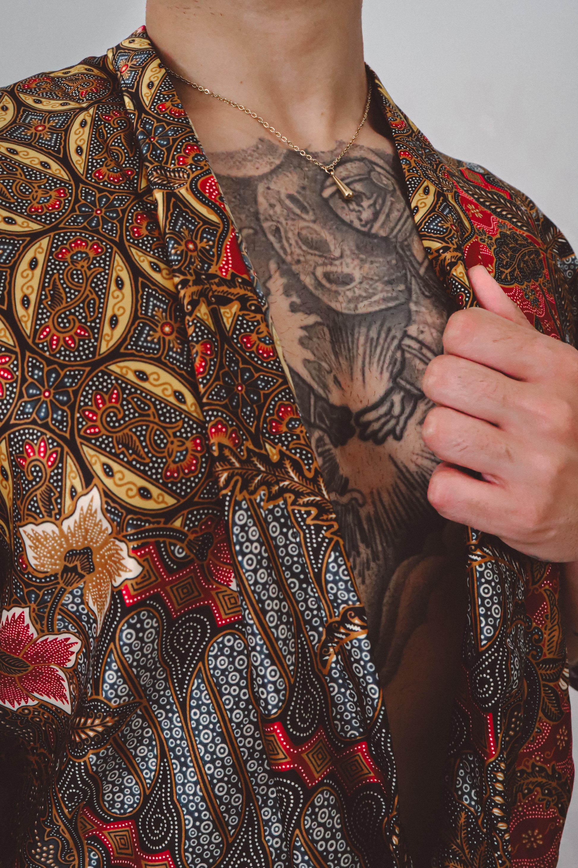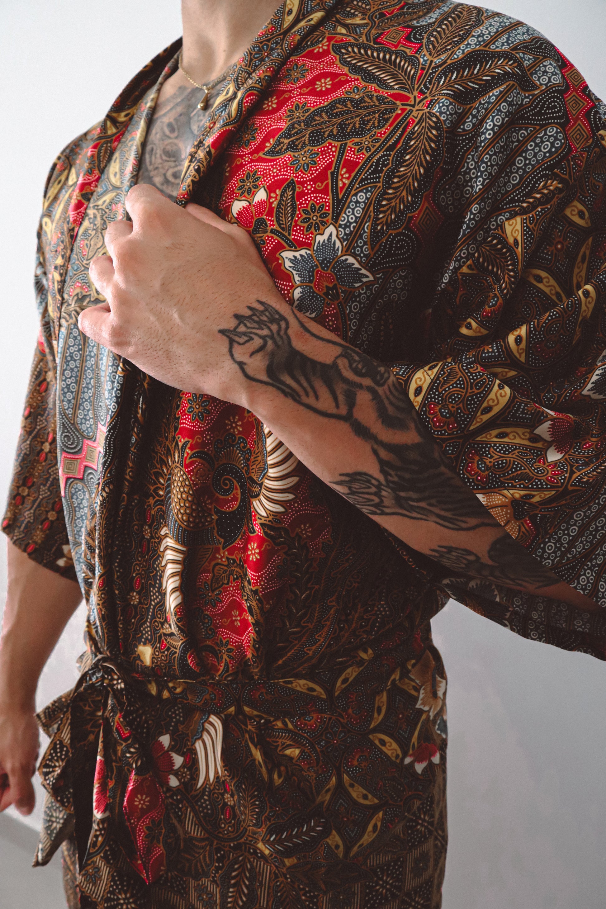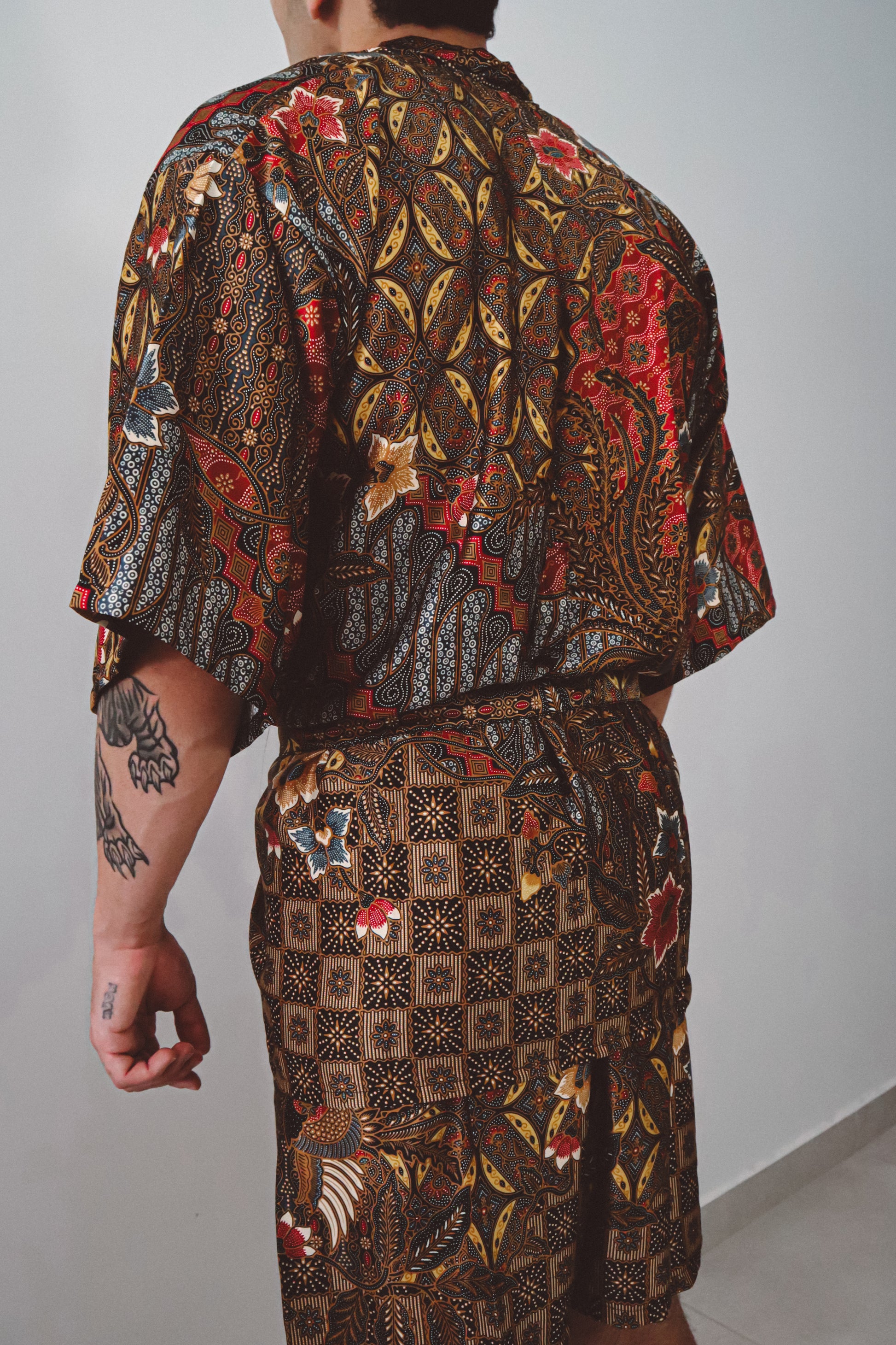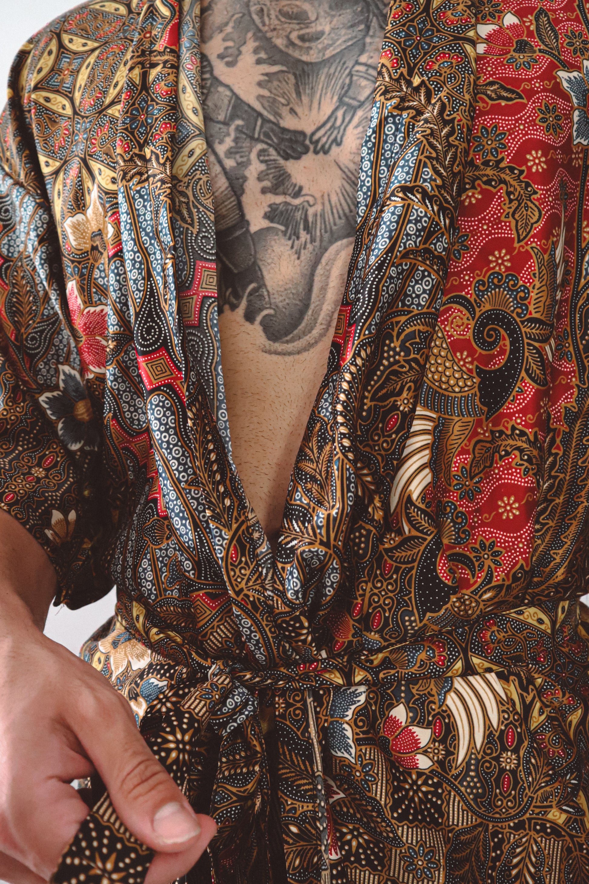 Fusion audacieuse de tradition et d'audace, cet ensemble kimono et short fait main captive l'attention avec sa base en soie noire profonde, rehaussée de détails floraux rouge vif, jaune soleil et bleu électrique. Conçu pour ceux qui vivent et s'habillent avec audace, cet ensemble incarne force intérieure, passion et liberté d'esprit.