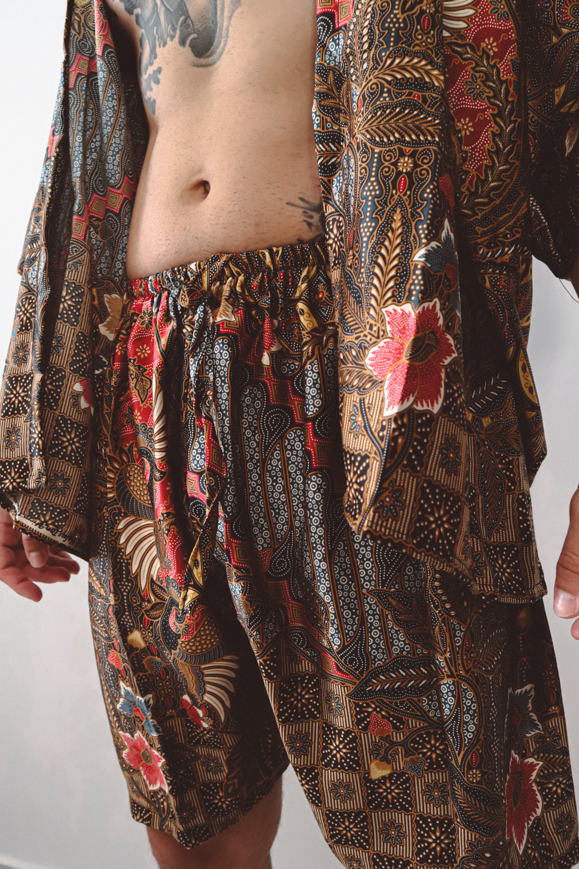 Ensemble kimono et short en soie à fleurs rouges, jaunes et bleues pour homme
