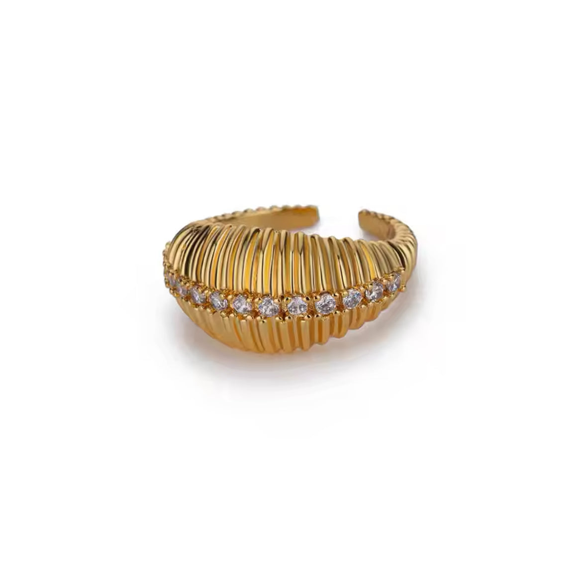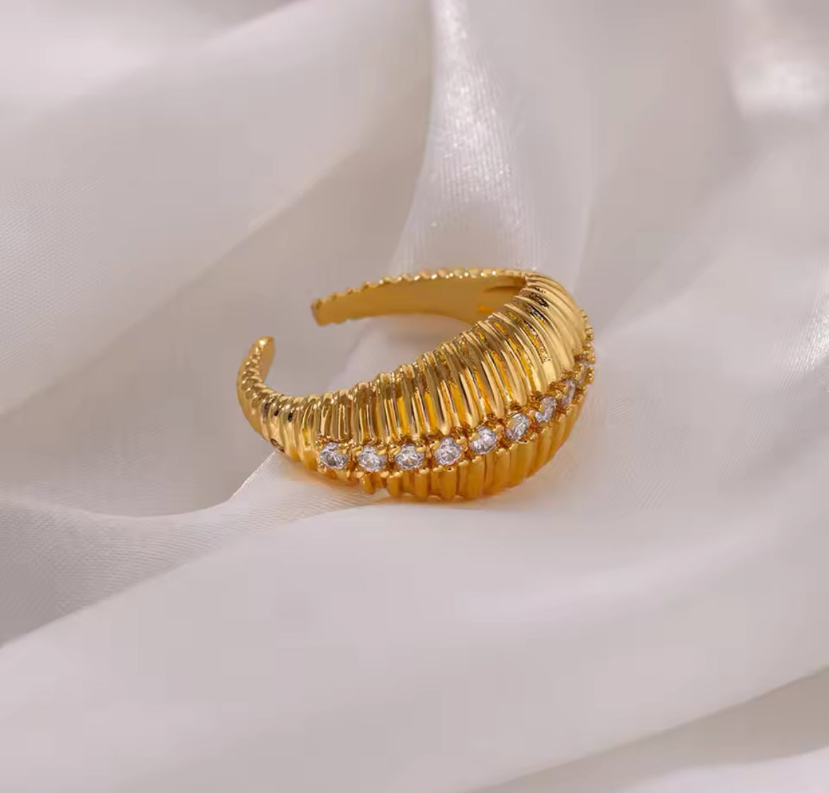 Accents de zircons : Ornée de détails complexes en zircons, cette bague scintille d'élégance, accentuant son attrait luxueux. Les pierres sont serties pour capter la lumière avec élégance, ajoutant de l'éclat à ce design audacieux.
