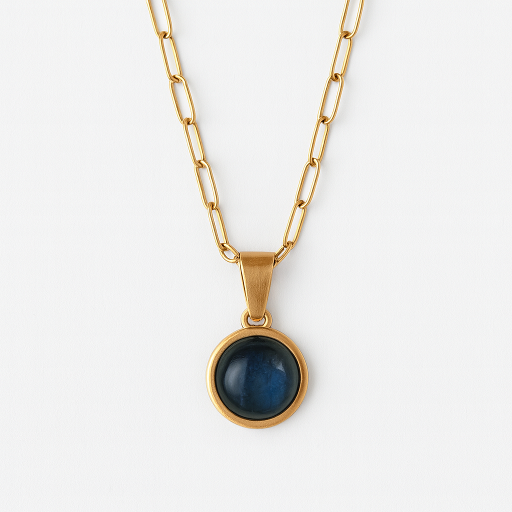 Stainless Steel Pendant: Available in a radiant gold stainless steel finish, highlighting a polished grade AAA labradorite gemstone measuring 10mm in diameter.
