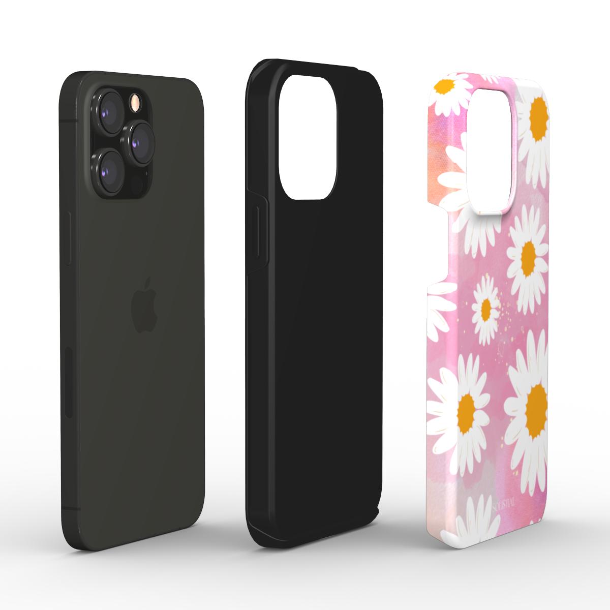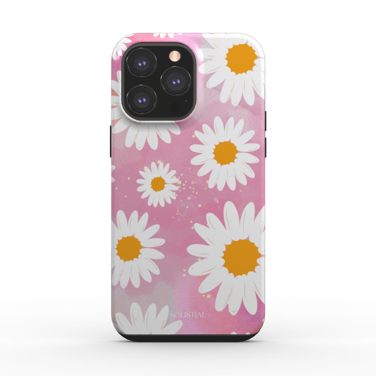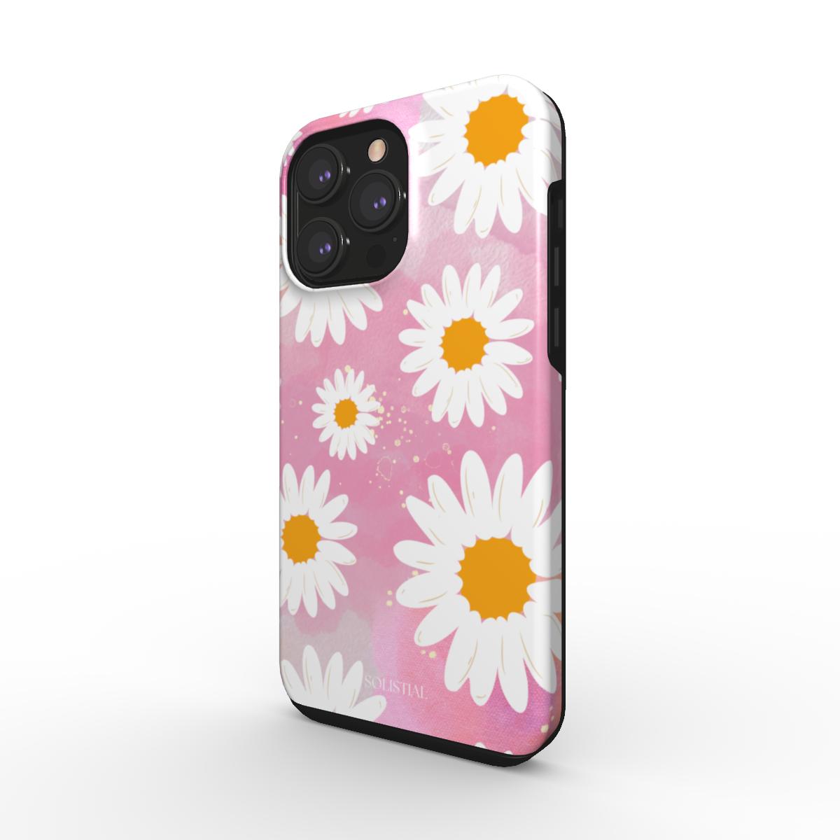 Pink Background with Daisy Flowers: The "Call Me Daisy" tough phone case showcases a lovely pink backdrop adorned with vibrant daisy flowers, creating a joyful and whimsical look for your phone.