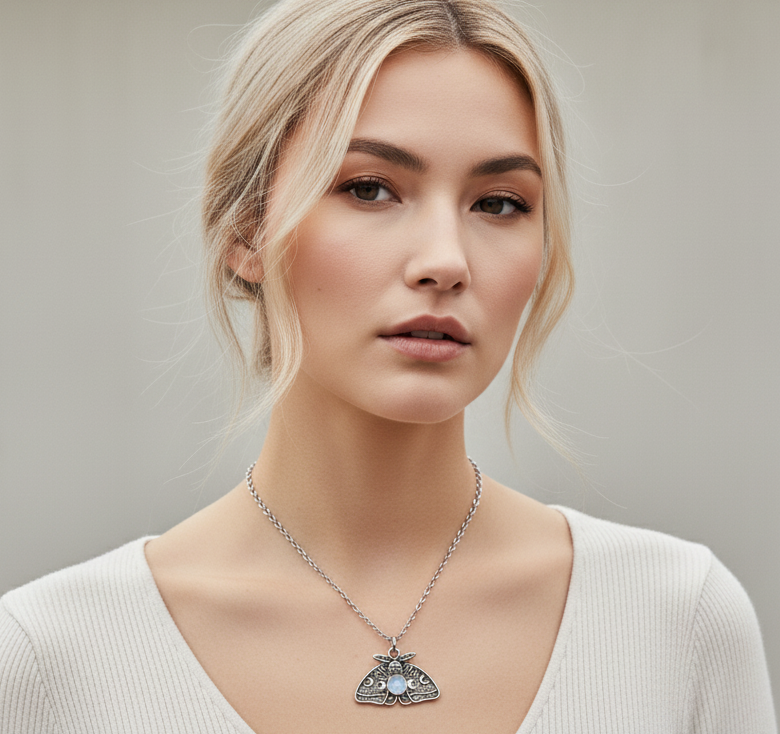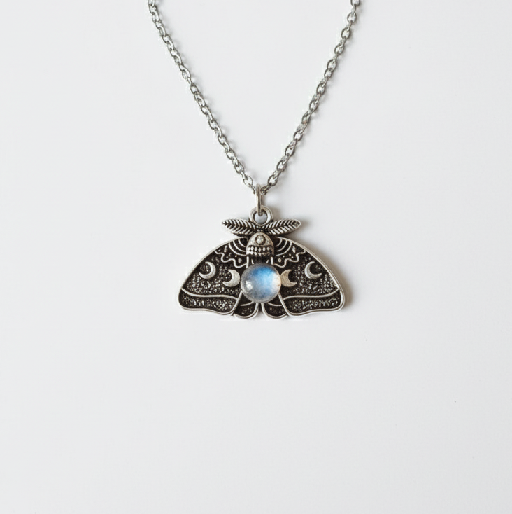 The Moon Moth Pendant Necklace is an ode to transformation, intuition, and celestial wonder. At its center rests your choice of a polished gemstone—rainbow moonstone, labradorite, lapis lazuli, or amethyst—each radiating its own unique energy and light. Framed by a delicate moth design and crowned with silver moon phases, this piece captures the mystery of night, the rhythm of cycles, and the beauty of renewal.
