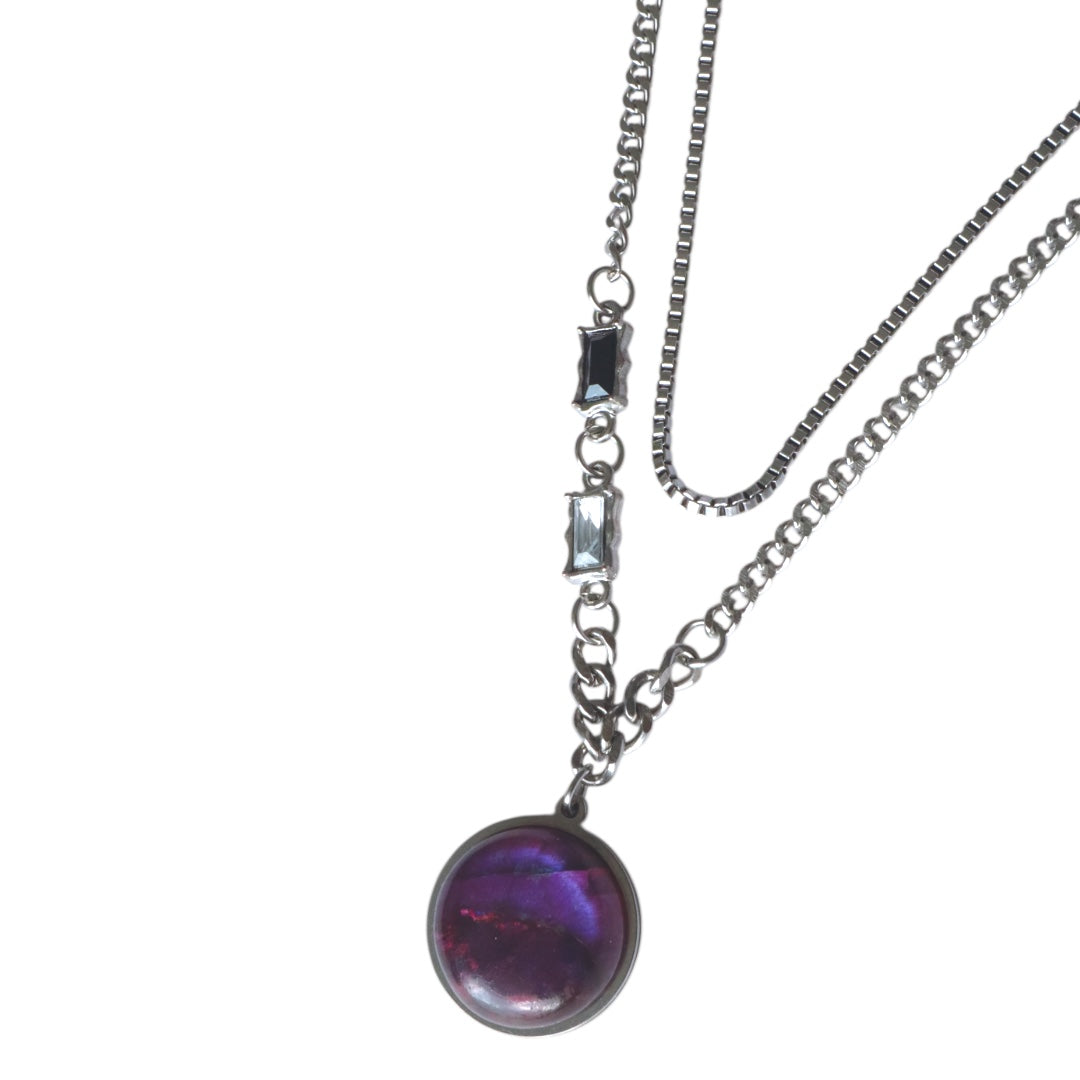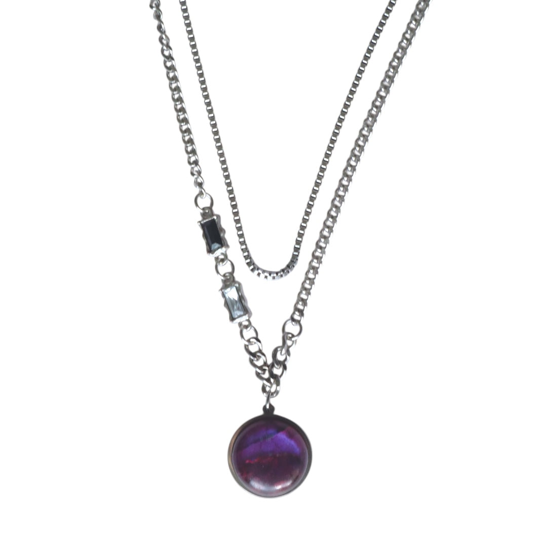 Born of night and starlight, Nyx is a tale told in layers—mysterious, luminous, and endlessly shifting. This double-strand necklace pairs a sleek silver box chain with a mixed media strand adorned in black and white rhinestones, cascading into a singular polished round pendant of purple labradorite.