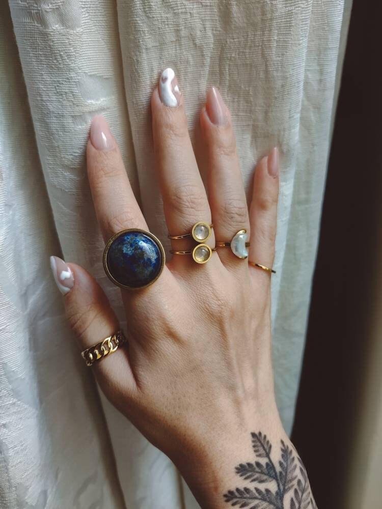A dainty crystal ring made of gold stainless steel with an adjustable band. The ring features a round polished rainbow moonstone crystal in AAA quality of 6mm in diameter. Packaging Each item is packaged keeping in mind an eco friendly policy. Jewelry is presented in a reusable organza bag in a recyclable/reusable gift box.